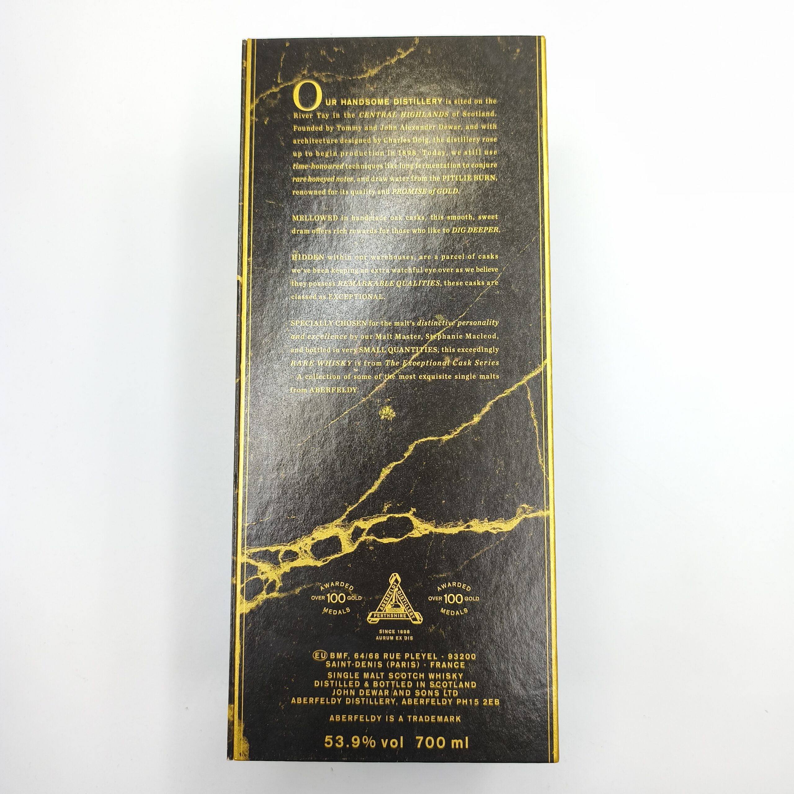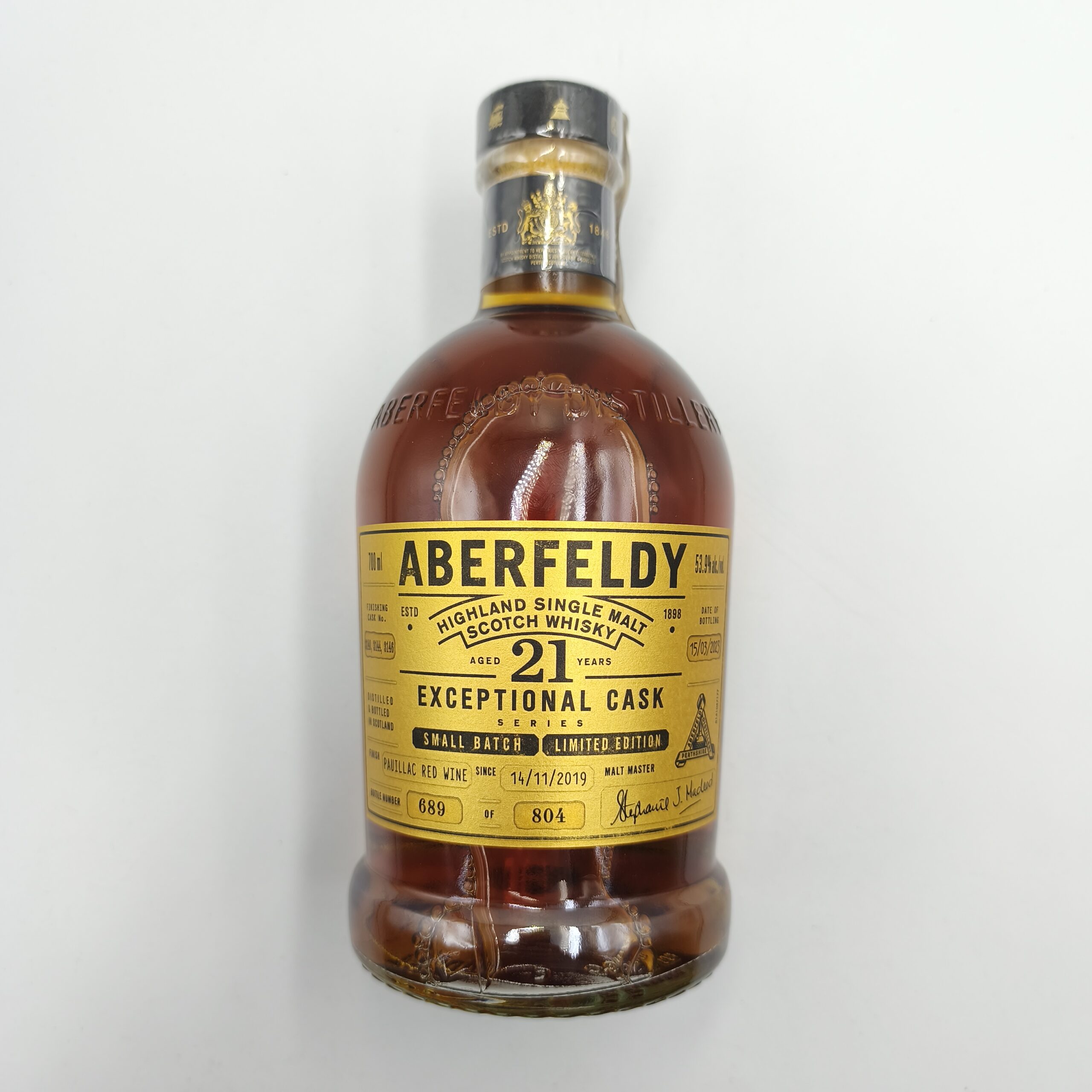 Aberfeldy 21YO Exceptional Cask Pauillac Red Wine Cask Finish 53,9% 0,7 L to limitowana edycja single malt whisky ze szkockiej destylarni Aberfeldy — część serii „Exceptional Cask”. Po 21 latach dojrzewania whisky została wykończona (finish) w beczkach po czerwonym winie z regionu Pauillac w Bordeaux, co nadaje trunkowi unikalny charakter — łączy miodową słodycz i łagodność typową dla Aberfeldy z głębią, owocowością i strukturą zaczerpniętą z beczek po winie. To whisky łącząca klasyczne cechy Highland single malt (słodycz, miód, łagodność) z nieoczywistą głębią i owocowo-taniczną strukturą zaczerpniętą z winnej beczki Pauillac — efekt końcowy jest interesujący i warstwowy.