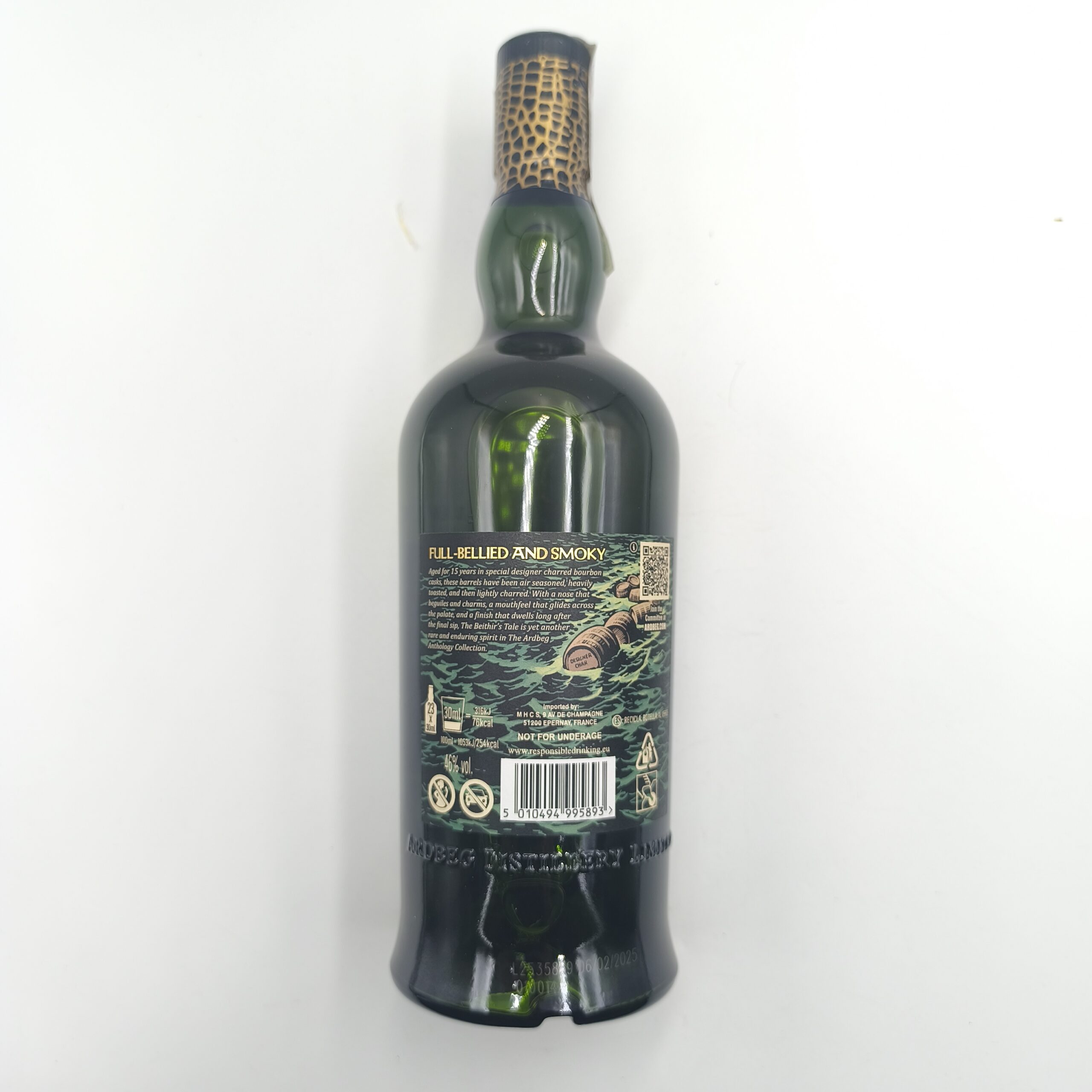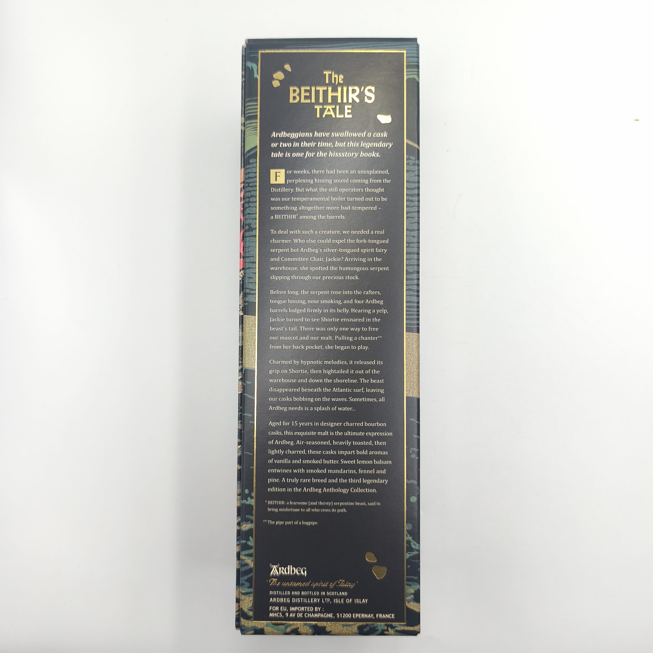 Ardbeg Anthology 15-letni „The Beithir’s Tale” to część limitowanej serii Anthology destylarni Ardbeg z wyspy Islay. Seria ta opiera się na mitologicznych opowieściach, a edycja „Beithir’s Tale” inspirowana jest legendą o potworze Beithir, który według lokalnych podań nawiedzał magazyny destylarni. Whisky dojrzewała przez 15 lat w beczkach po bourbonie – beczki są mocno wyprażone („charred”), co nadaje trunkowi głębię i bogactwo smaku. Butelkowana jest z zawartością alkoholu 46% ABV, bez filtrowania na zimno (non-chill filtered), co pomaga zachować naturalny charakter destylatu.