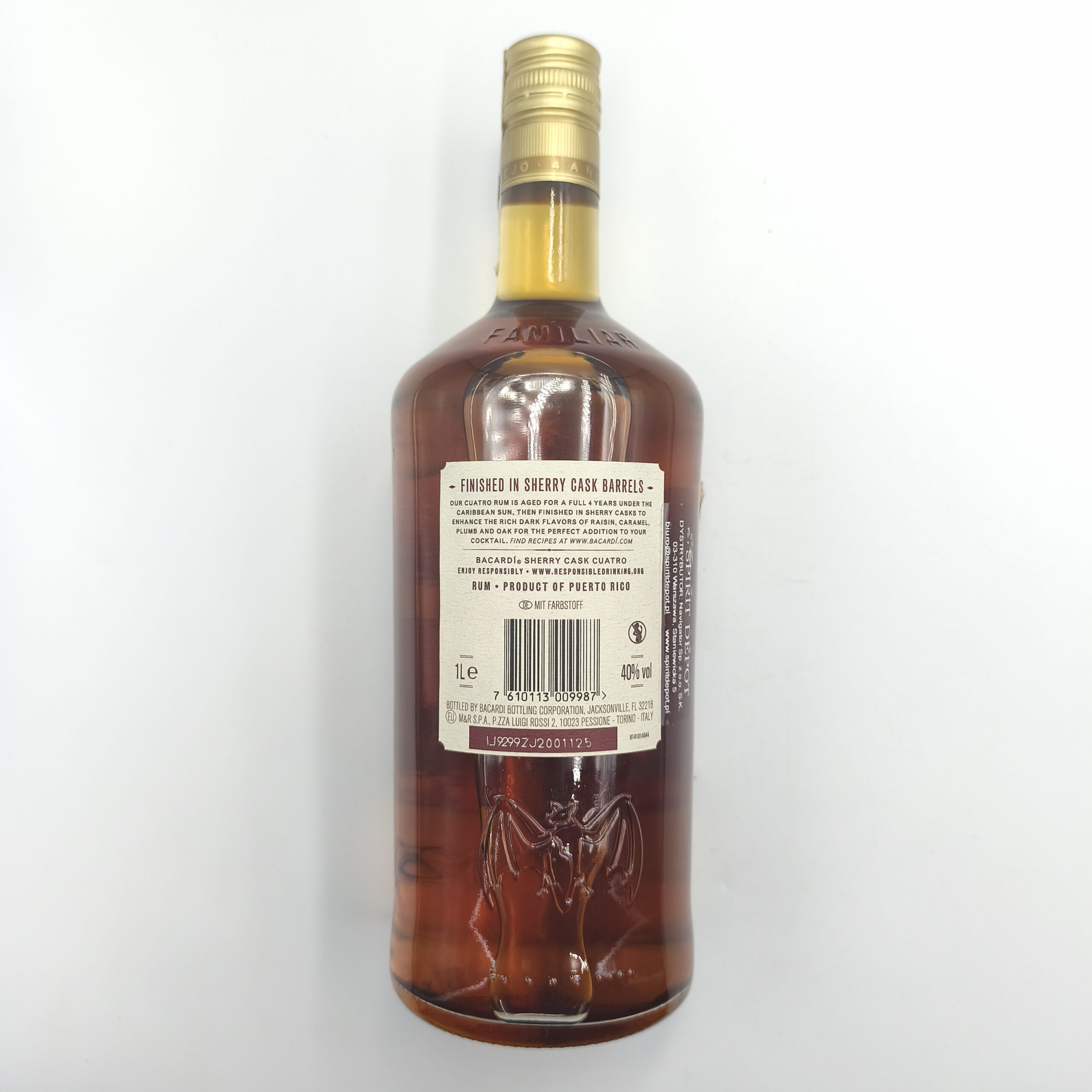 BACARDI CUATRO SHERRY CASK 40% 1 L to limitowana edycja rumu od Bacardi, która łączy cztery lata starzenia w klimacie karaibskim z dodatkowym finiszem w beczkach po sherry. Producentem jest globalna firma Bacardi International, a sam destylat pochodzi z zakładów Bacardi (m.in. z Puerto Rico). Bacardi to marka z długą historią — założona w 1862 roku przez Don Facundo Bacardí Massó. Proces produkcji zaczyna się od podstawowego rumu, który dojrzewa przez cztery lata w standardowych beczkach dębowych na Karaibach. Po tym etapie następuje dodatkowe dojrzewanie w beczkach po sherry, co nadaje trunkowi bardziej złożony, wino-inspirowany charakter. Butelka ma pojemność 1 litra i zawiera alkohol na poziomie 40% ABV. Kolor rumu po dojrzewaniu to złocisty / bursztynowy, wynikający z wpływu sherry beczek.