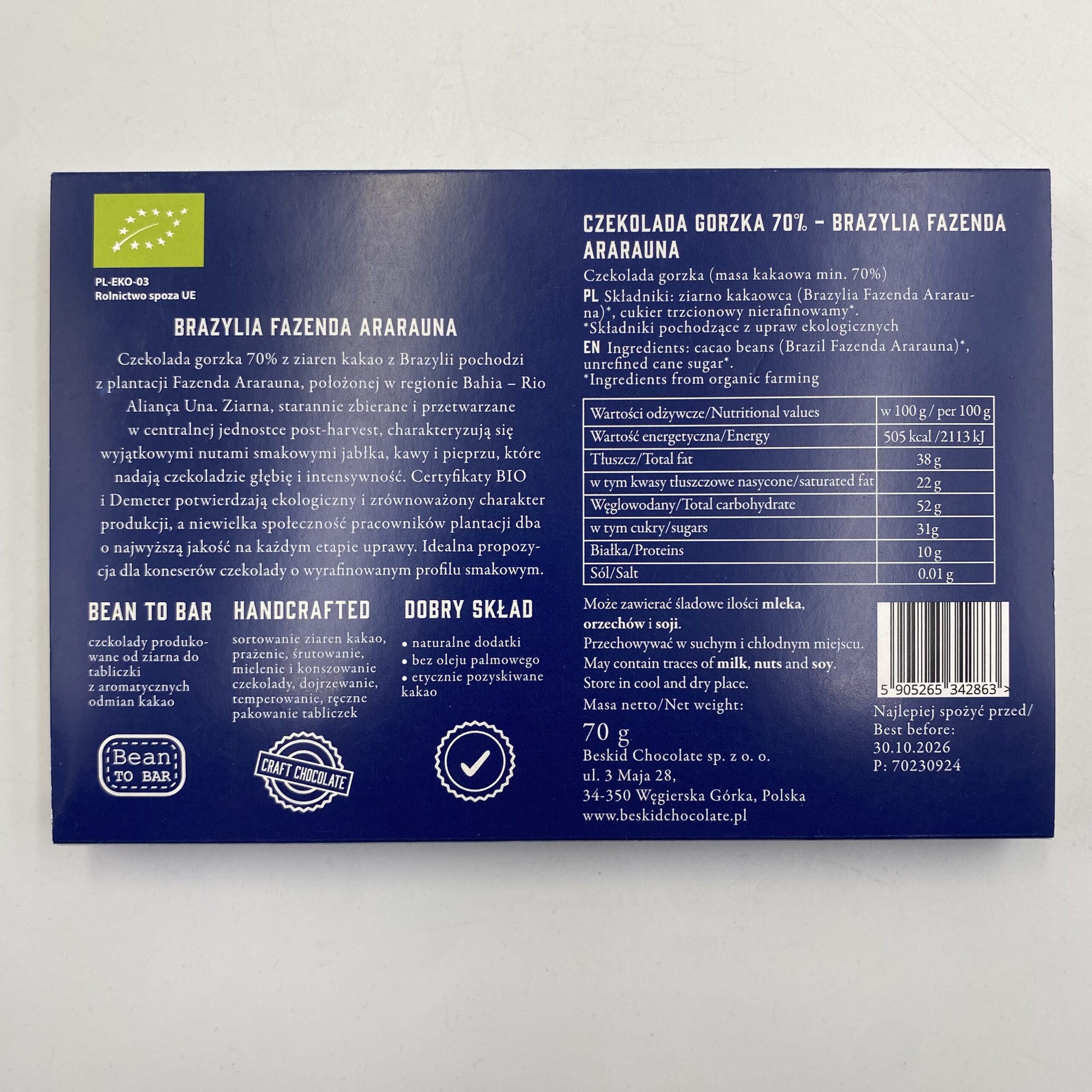 Czekolada gorzka 70% z ziaren kakao z Brazylii pochodzi z plantacji Fazenda Ararauna, położonej w regionie Bahia – Rio Aliança Una. Ziarna, starannie zbierane i przetwarzane w centralnej jednostce post-harvest, charakteryzują się wyjątkowymi nutami smakowymi jabłka, kawy i pieprzu, które nadają czekoladzie głębię i intensywność. Certyfikaty BIO i Demeter potwierdzają ekologiczny i zrównoważony charakter produkcji, a niewielka społeczność pracowników plantacji dba o najwyższą jakość na każdym etapie uprawy. Idealna propozycja dla koneserów czekolady o wyrafinowanym profilu smakowym.