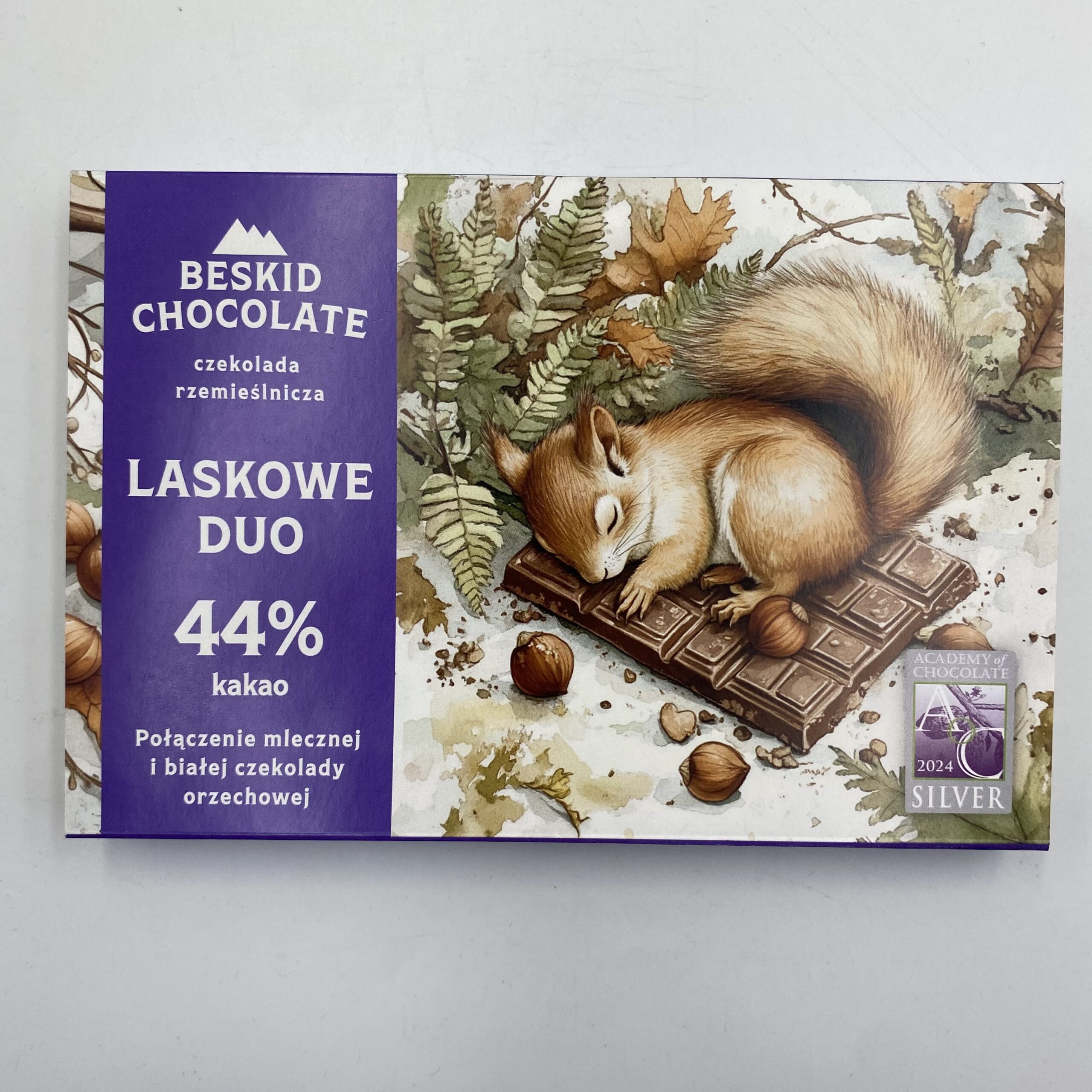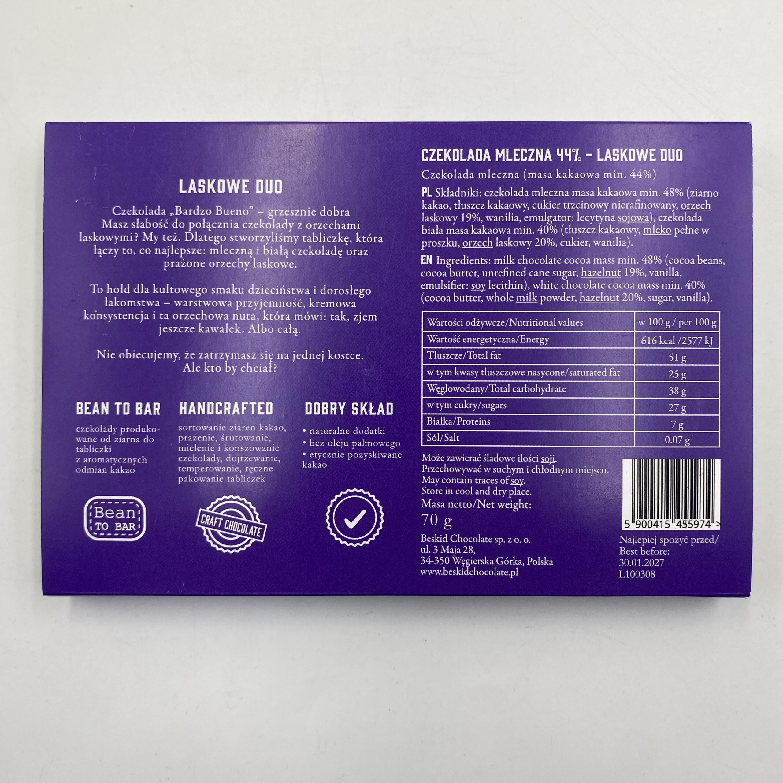 Dlaczego wybierać między białą a mleczną, skoro można mieć obie? Laskowe Duo to harmonijne połączenie dwóch warstw czekolady: mlecznej i białej, z każdej strony wzbogaconej aromatyczną pastą z prażonych orzechów laskowych.
