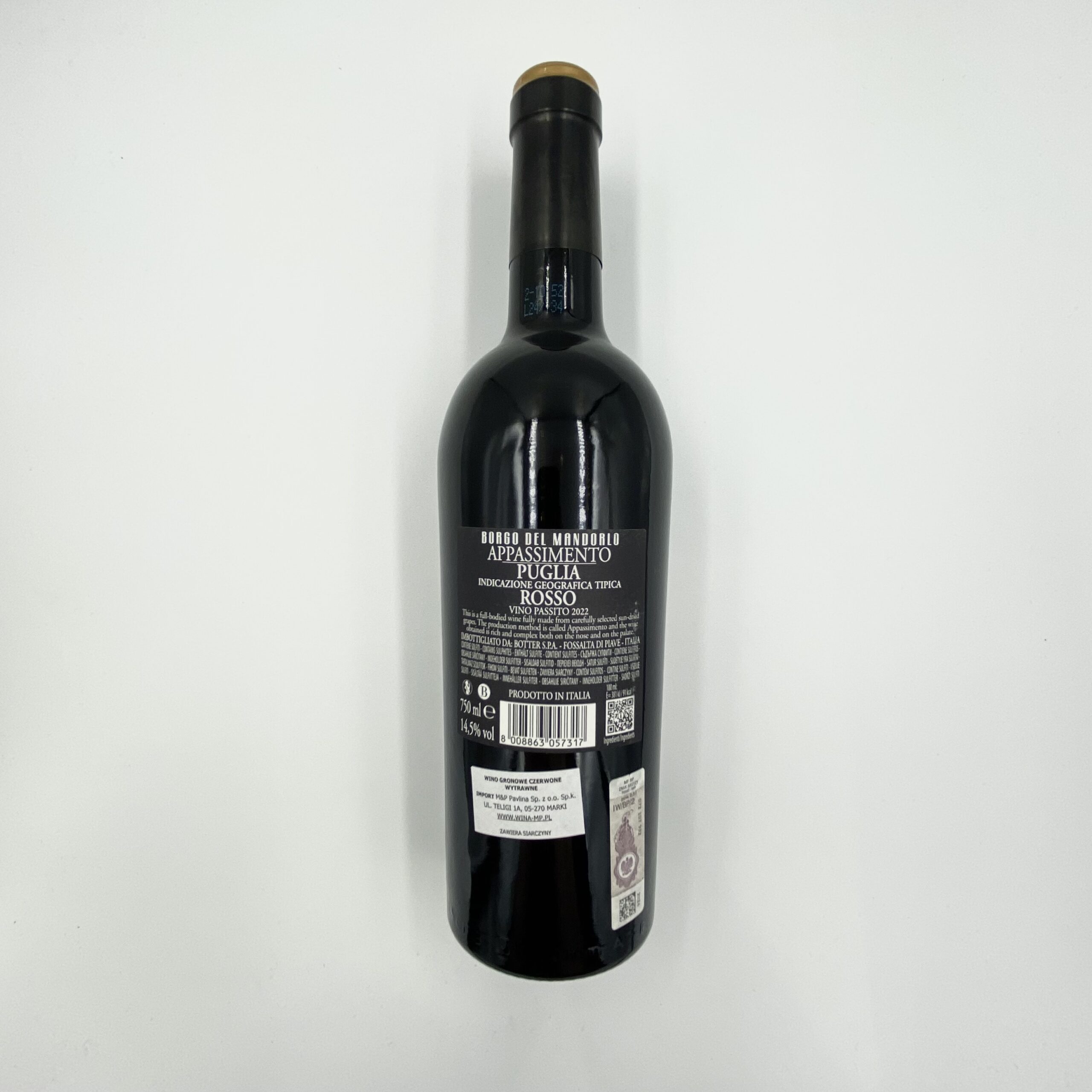 Borgo del Mandorlo Puglia Appassimento 2022 powstają z ręcznie zbieranych i starannie selekcjonowanych winogron Negroamaro, Malvasia, Merlot i Cabernet Sauvignon. Podsuszane przez 15 dni, podczas których straciły ok 50% swojej objętości. Wino następnie dojrzewało przez 3-4 miesiące w beczkach dębowych. Idealne do pieczeni, dziczyzny i serów.