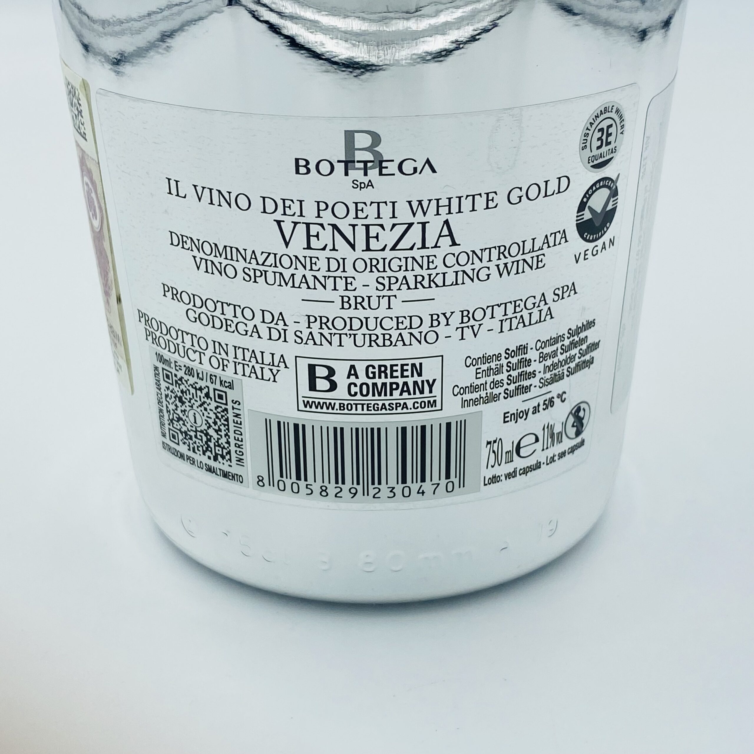 Bottega White Gold to włoskie wino musujące z apelacji Venezia DOC, produkowane przez Bottega SpA w regionie Veneto — winogrona użyte do jego produkcji to mieszanka Glera, Chardonnay i Pinot-Blanc (w niektórych opisach pojawia się też Pinot Nero / Pinot). Zawartość alkoholu to 11 %. Wino klasy Brut oznacza, że jest wytrawne, z umiarkowaną zawartością cukru resztkowego (około 10-13 g/l) i kwasowością między 5,00-6,50 g/l.