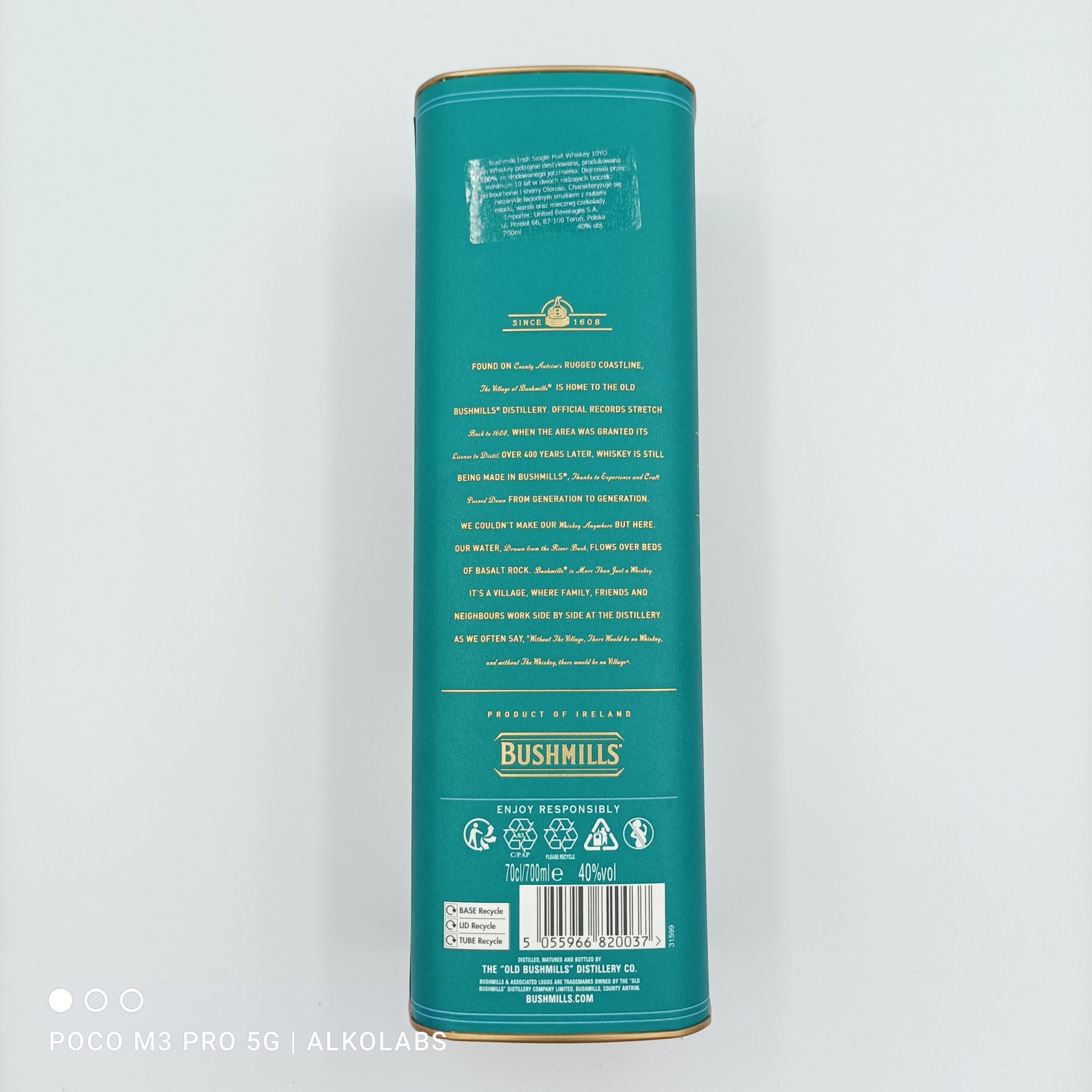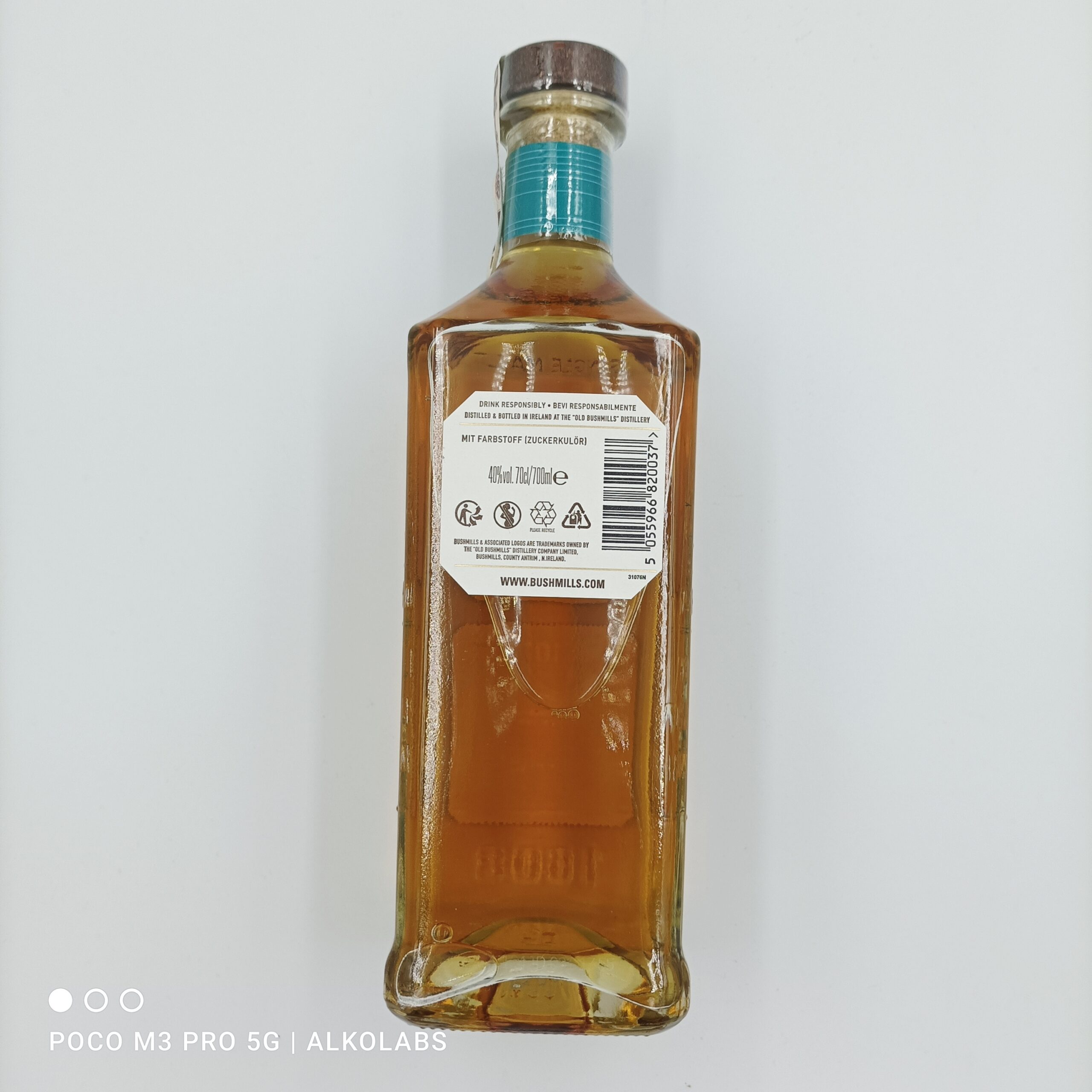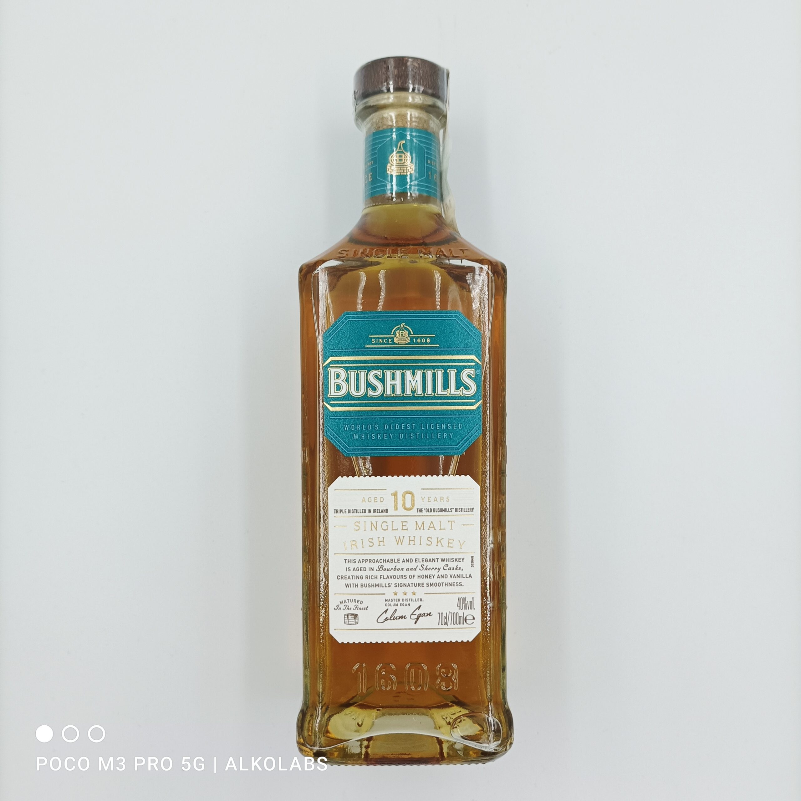 Bushmills 10 YO whisky produkowana z jęczmiennego słodu, trzykrotnie destylowanego. Zestawiona z destylatów starzonych w beczkach po bourbonie z dodatkiem beczek po sherry, końcowo bardzo łagodna w smaku. Ten 10 letni trunek idealnie sprawdzi się podany samodzielnie, na lodzie lub jako podstawa koktajlu.