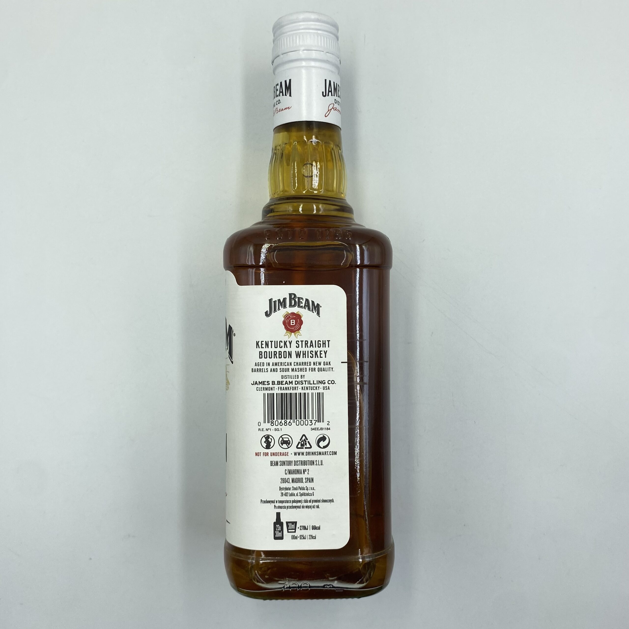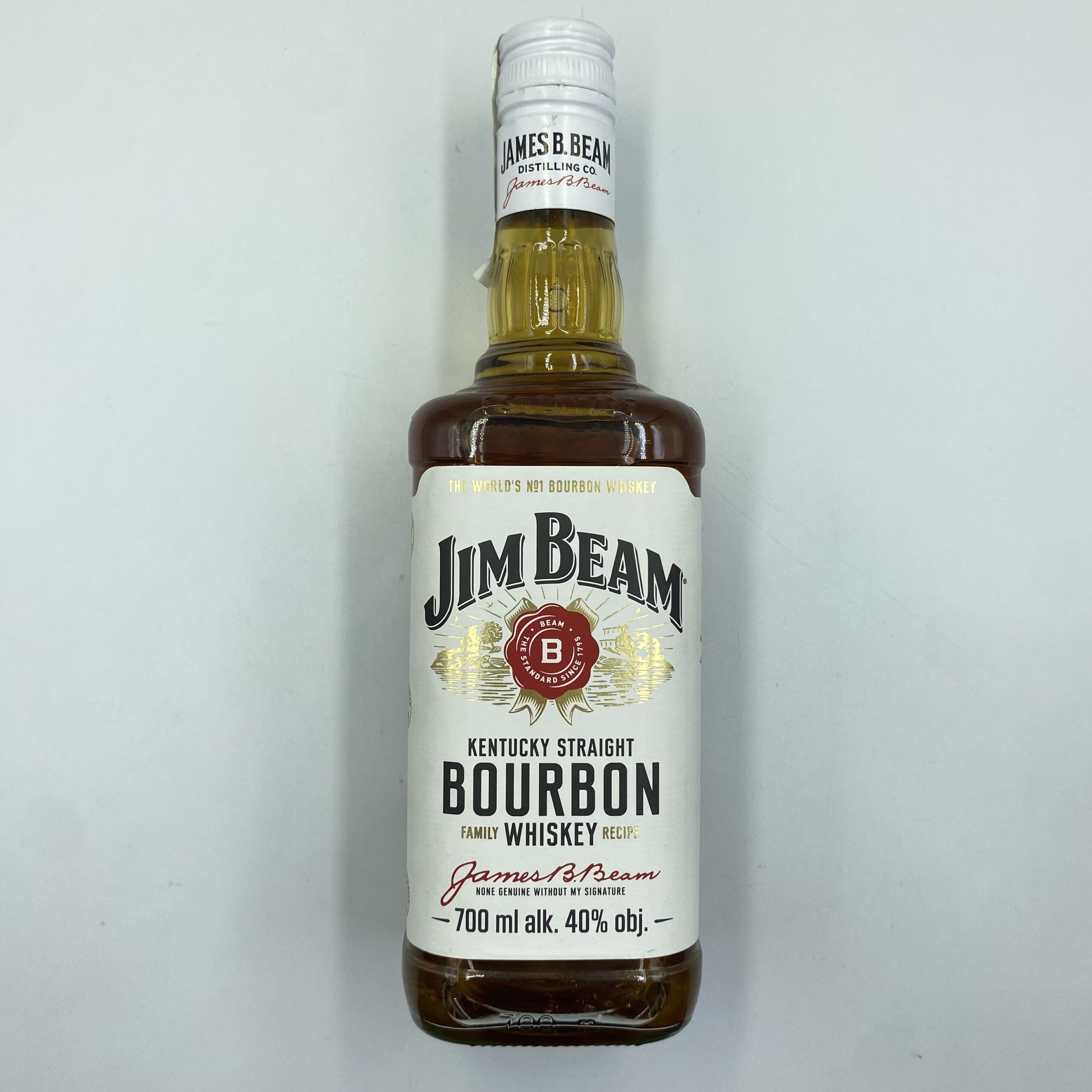 Jim Beam White Label to klasyczny amerykański bourbon z Kentucky, produkowany według rodzinnej receptury od ponad dwóch stuleci. Dojrzewa minimum cztery lata w nowych, opalanych od środka beczkach z amerykańskiego dębu, co nadaje mu charakterystyczny, lekko słodki i dębowy profil z wyraźnym bourbonowym charakterem.