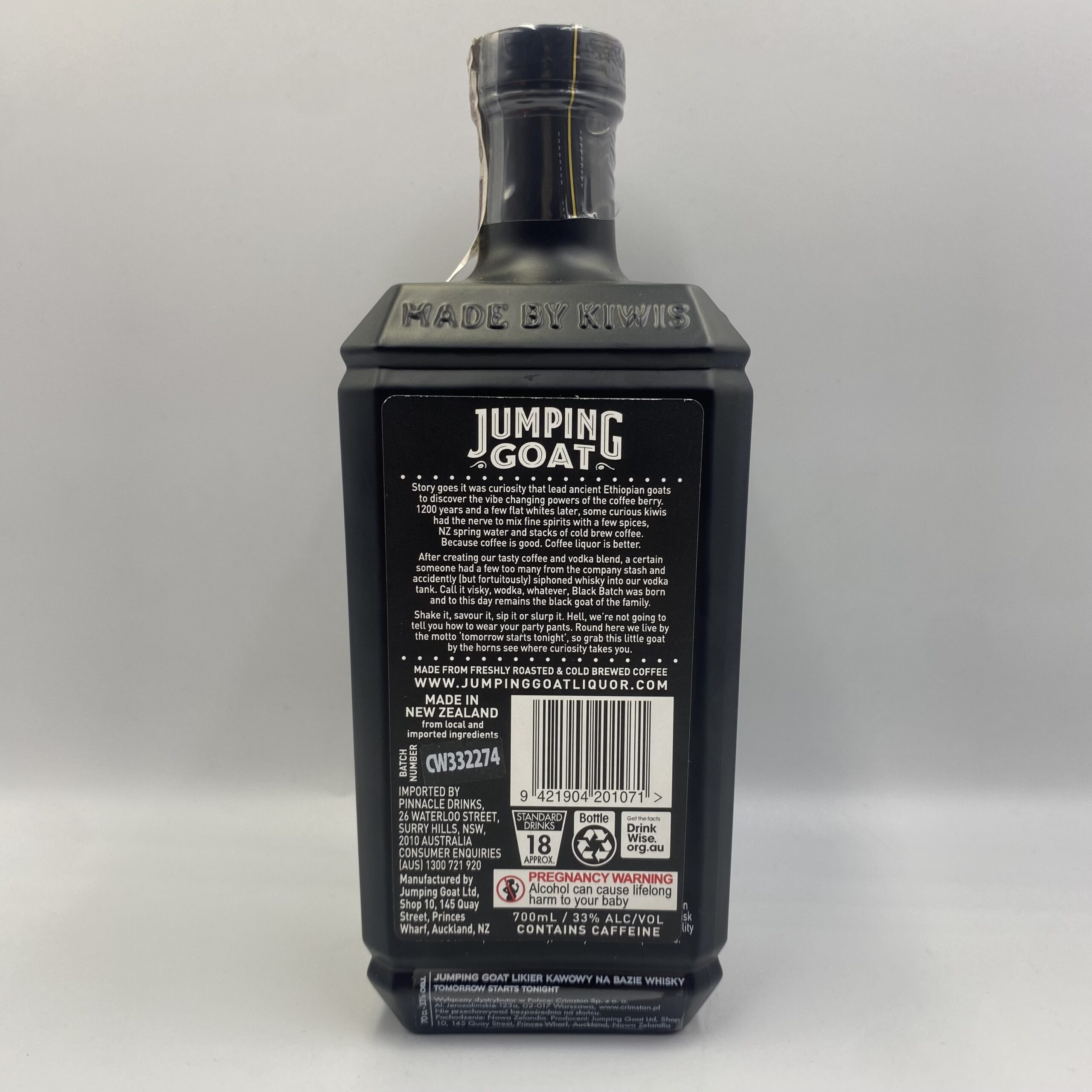 To kawowy likier z Nowej Zelandii, produkowany przez markę Jumping Goat. Bazuje na lokalnej wódce serwatkowej i dodatku szkockiej whisky z Tomintoul, co daje wyjątkowy balans między dymną nutą whisky a intensywnym aromatem kawy. W każdej butelce użyto aż 50 g organicznych, świeżo palonych ziaren kawowych cold brew, co zapewnia solidną dawkę prawdziwej kawy — a także stosunkowo sporą ilość kofeiny (~ 55‑60 mg na 100 ml).