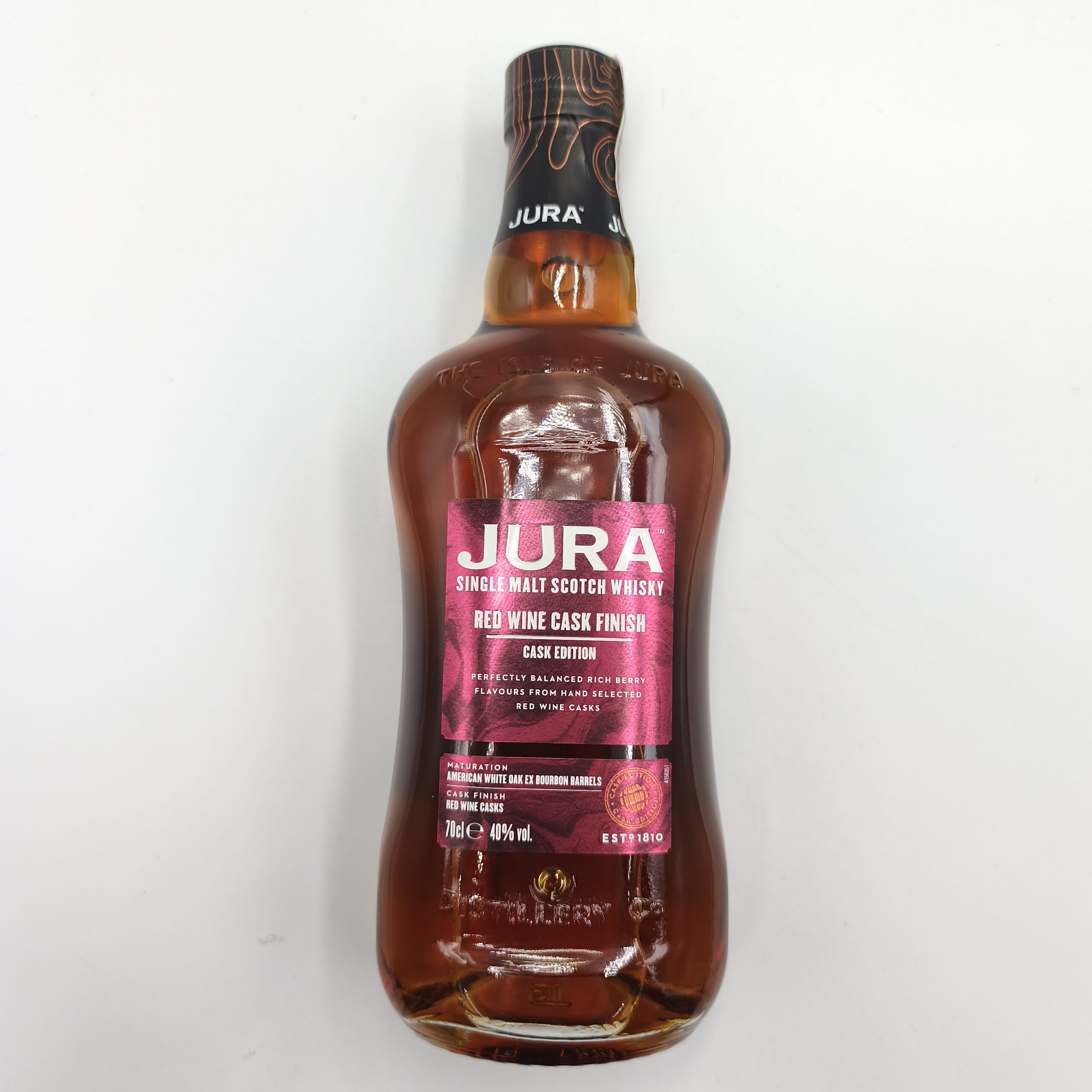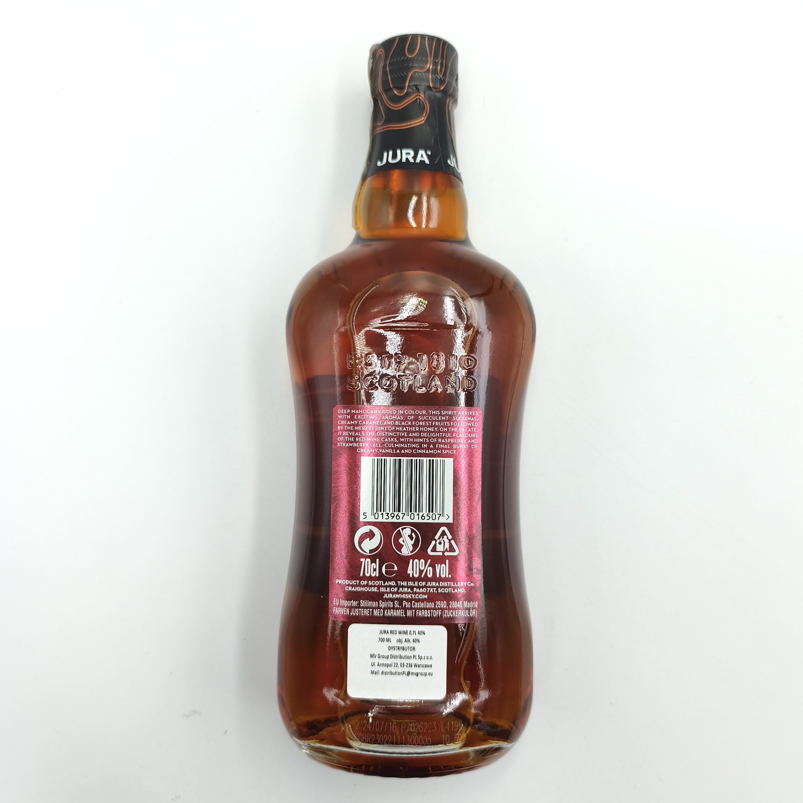 Jura Red Wine Cask Finish to szkocka whisky single malt pochodząca z destylarni Isle of Jura, zlokalizowanej na niewielkiej, surowej wyspie u zachodnich wybrzeży Szkocji. Whisky ta dojrzewa początkowo w beczkach z amerykańskiego dębu po bourbonie, a następnie finiszowana jest w beczkach po czerwonym winie, co nadaje jej bardziej owocowy i zaokrąglony charakter. Styl destylarni Jura znany jest z łagodności i równowagi, a wpływ beczek po winie podkreśla słodsze, winne akcenty przy zachowaniu wyspiarskiej elegancji. To przystępna, dobrze ułożona whisky, łącząca klasyczny profil Jura z dodatkową warstwą owocowej głębi.