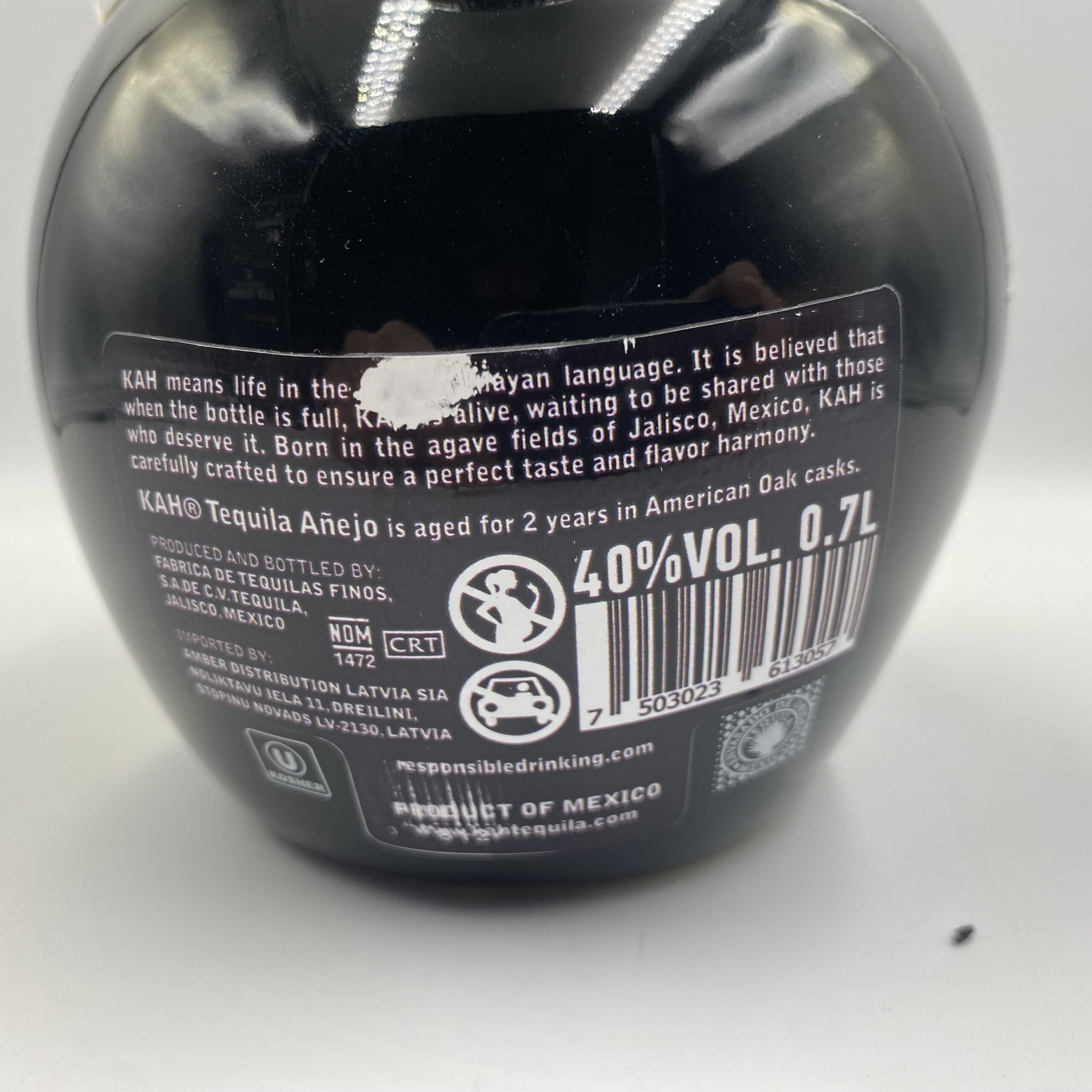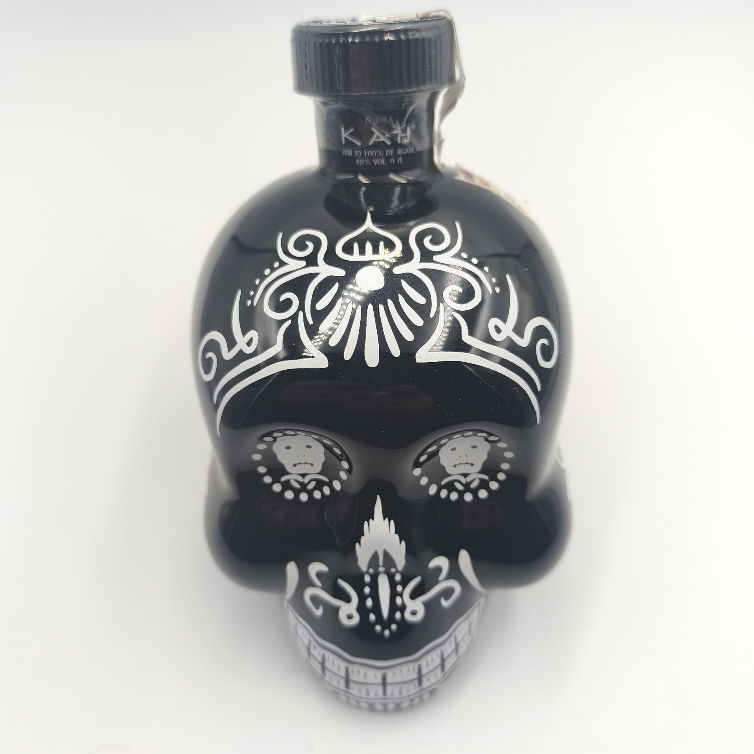 KAH Tequila Añejo 40% 0,7 L to meksykańska tequila z destylarni Fabrica de Tequilas Finos, która wyróżnia się charakterystyczną butelką w kształcie czaszki — inspirowaną tradycją Día de los Muertos (Dzień Zmarłych). Nazwa „Kah” w języku Majów oznacza „życie” — co w połączeniu z formą butelki tworzy silny symbol odrodzenia. Tequila powstaje w 100% z agawy niebieskiej (Blue Weber Agave) i dojrzewa przez ok. 2 lata w beczkach z amerykańskiego białego dębu.