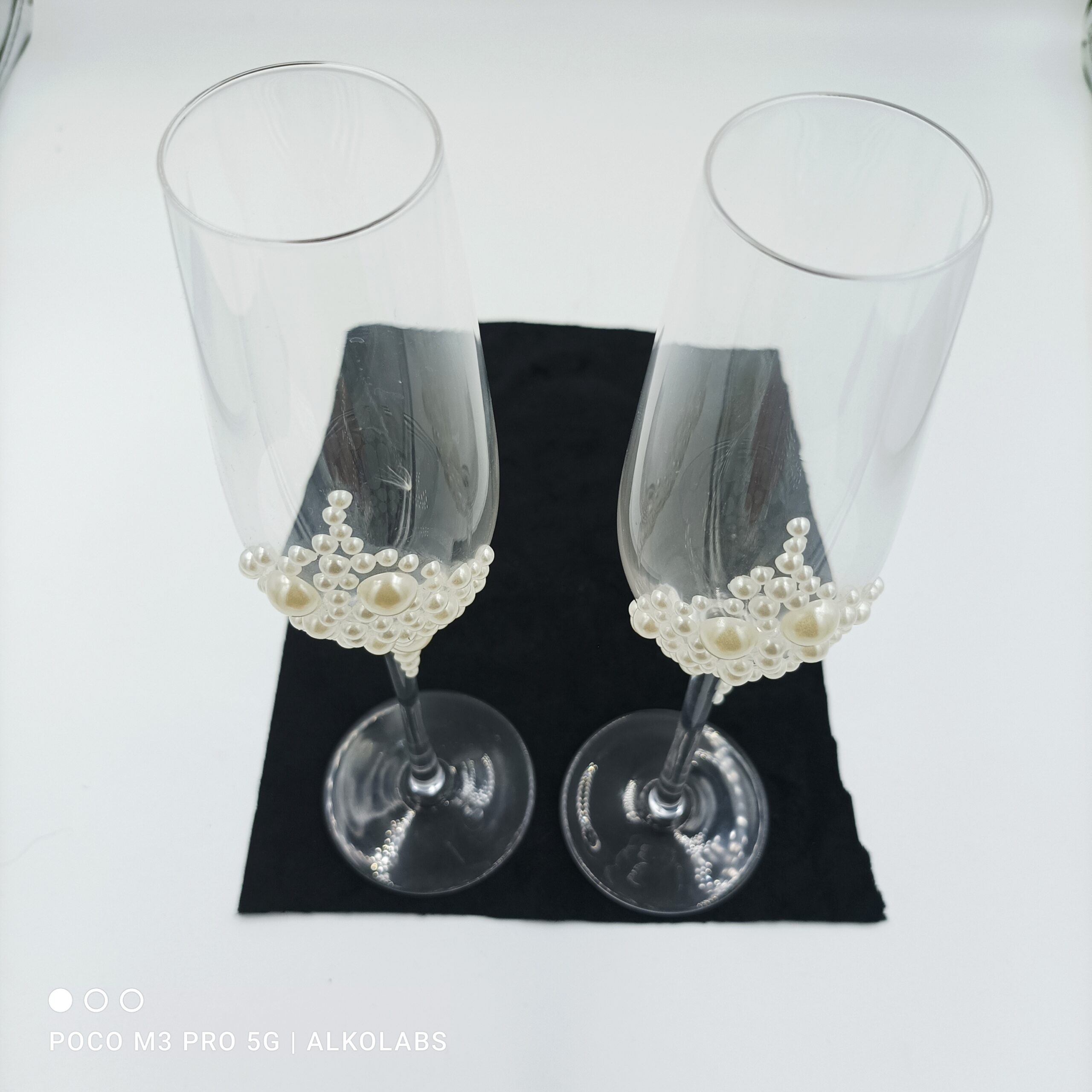 Dwa kieliszki do szampana ozdobione białymi perłami. Cena za komplet (dwie sztuki).