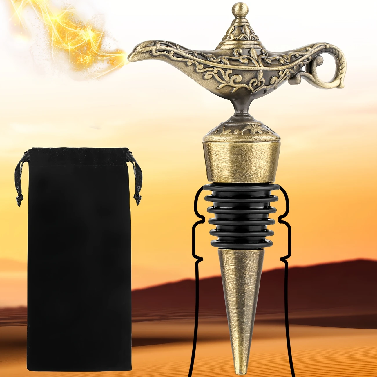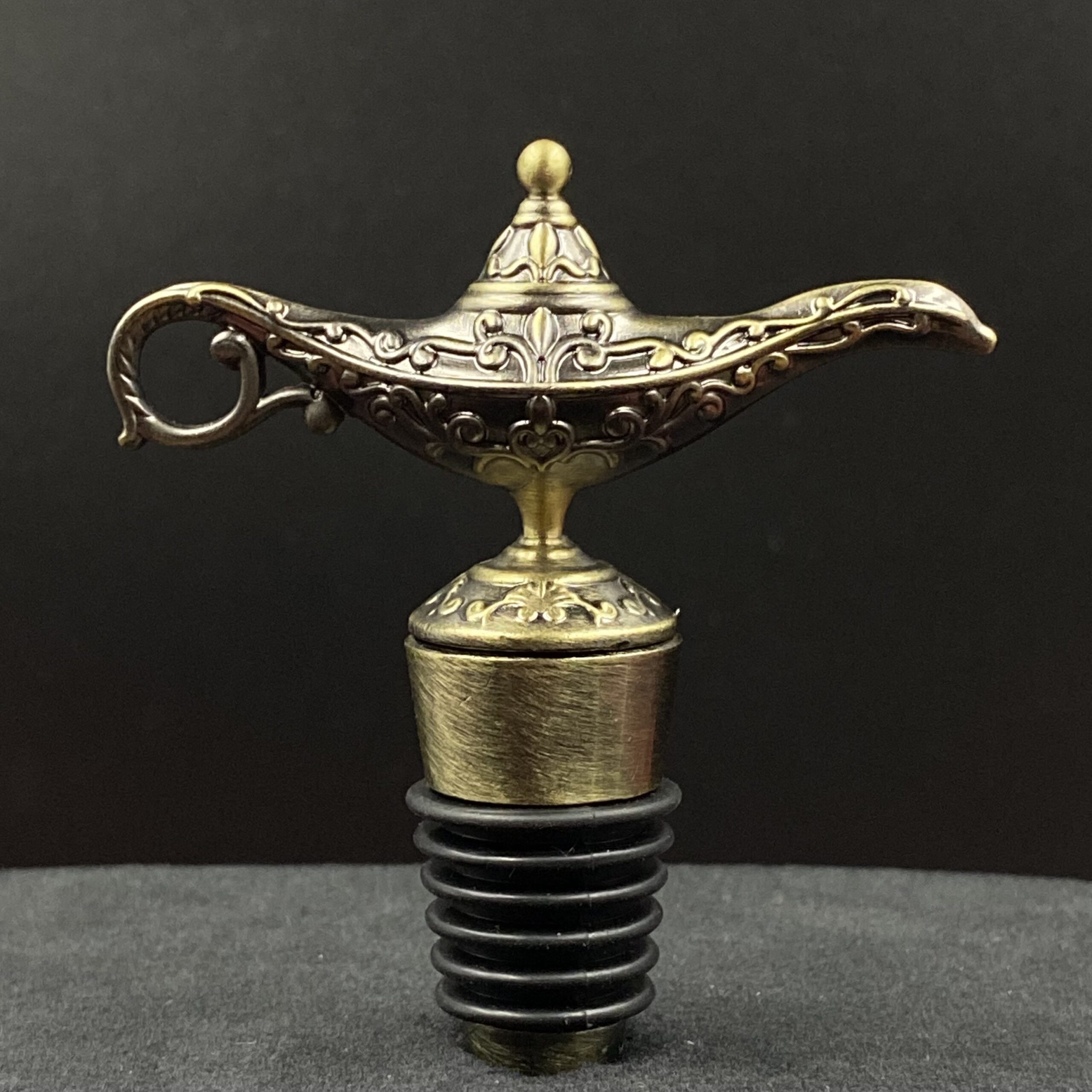 Uniwersalny korek do wina ze stali nierdzewnej w kolorze miedzianym zakończony rzeźbą w kształcie lampy gina.