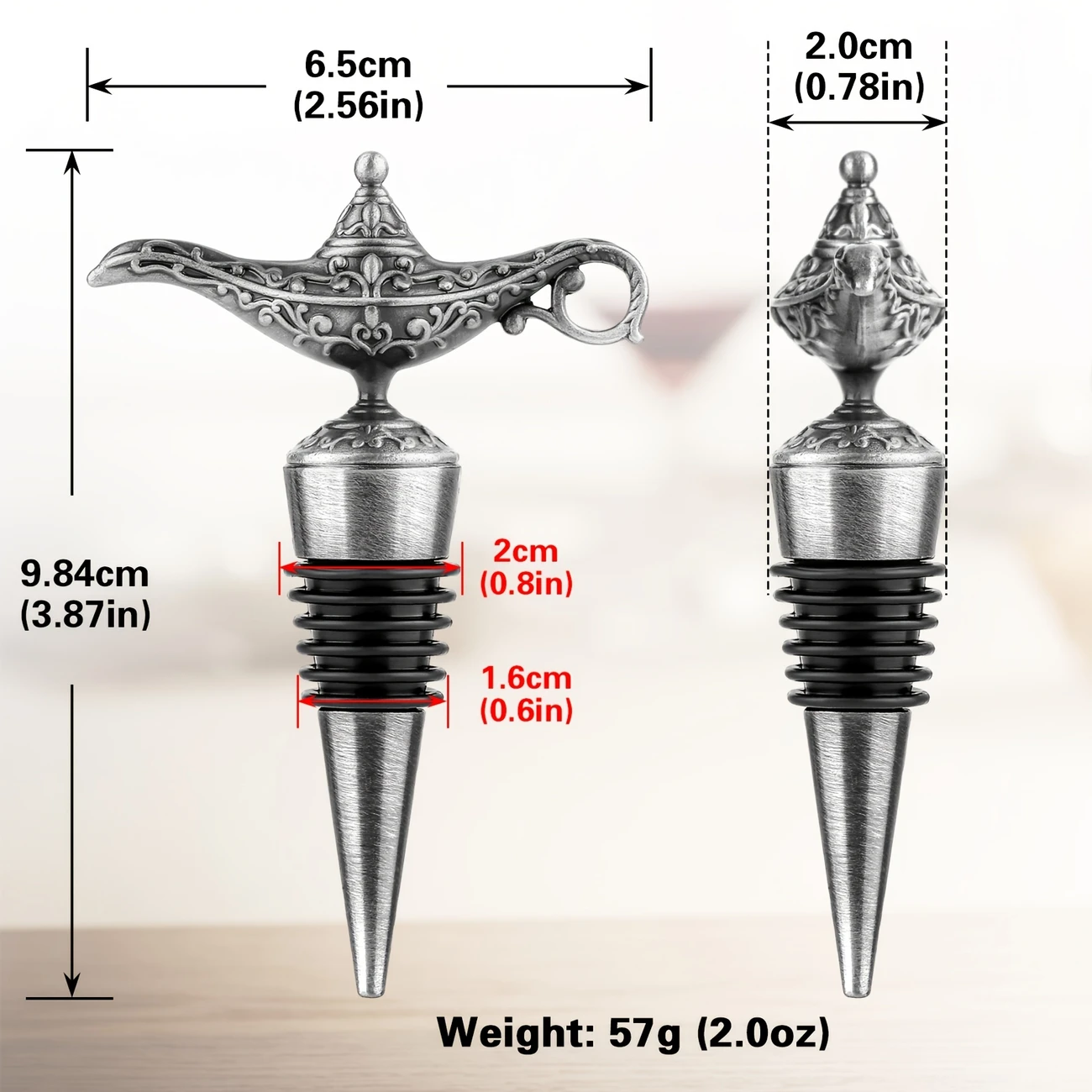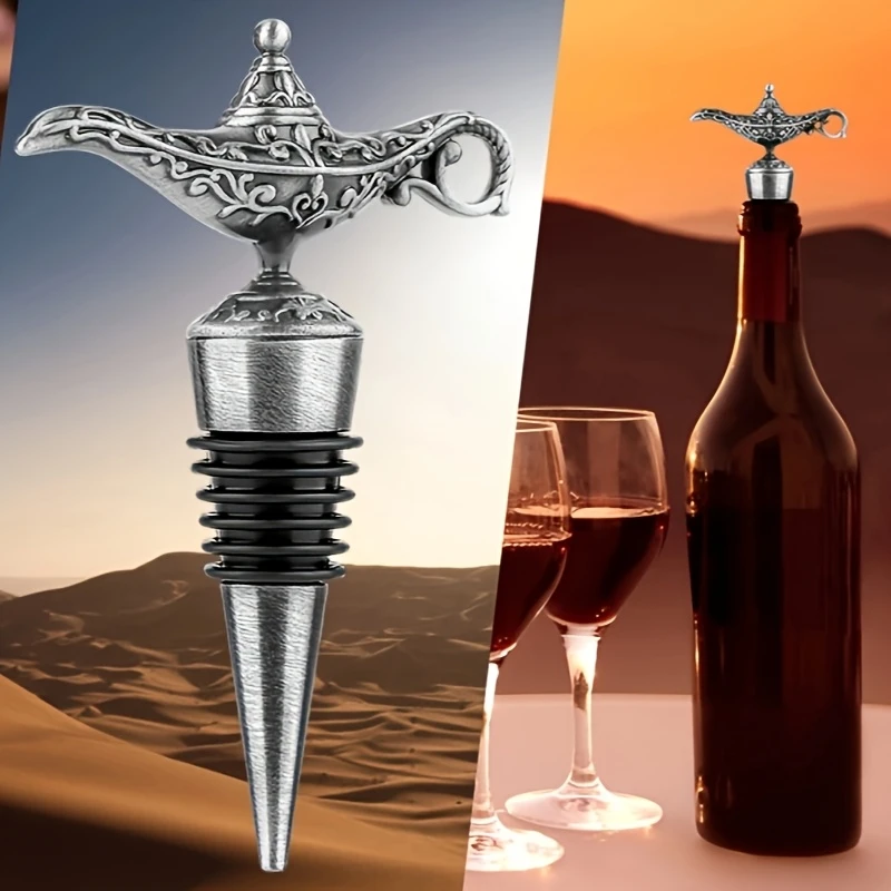 W MAGAZYNIEUniwersalny korek do wina ze stali nierdzewnej w kolorze srebrnym zakończony rzeźbą w kształcie lampy gina.