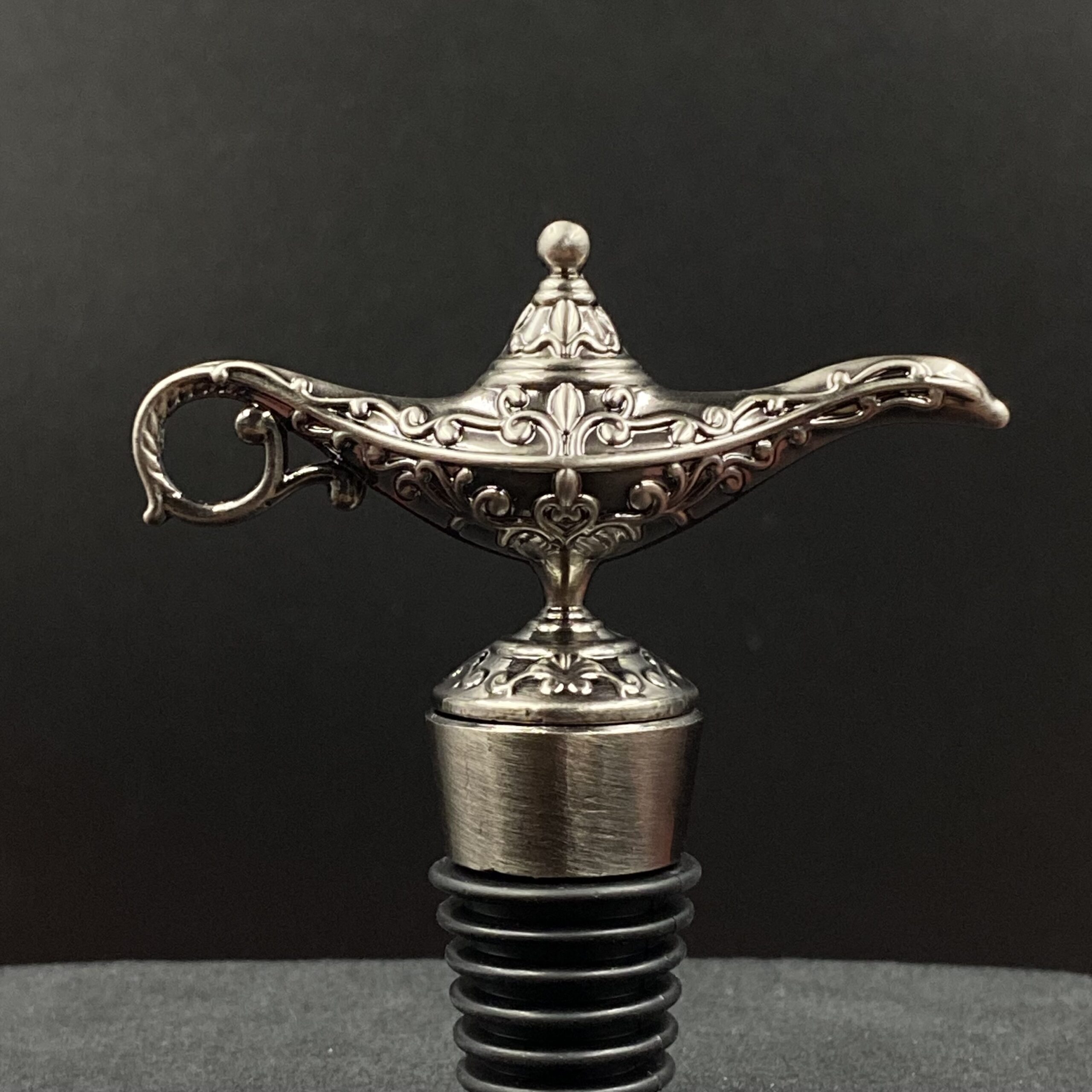 Uniwersalny korek do wina ze stali nierdzewnej w kolorze srebrnym zakończony rzeźbą w kształcie lampy gina.
