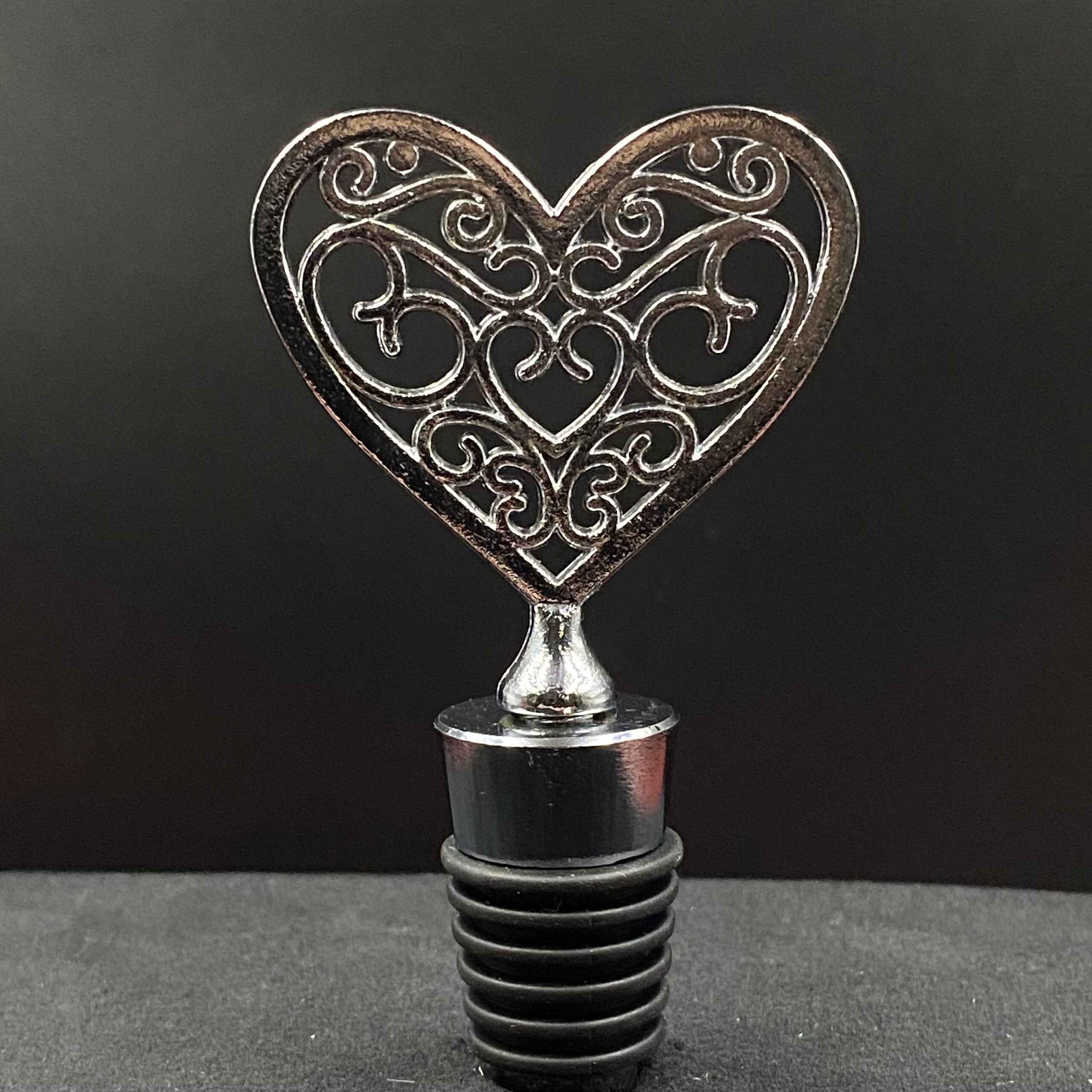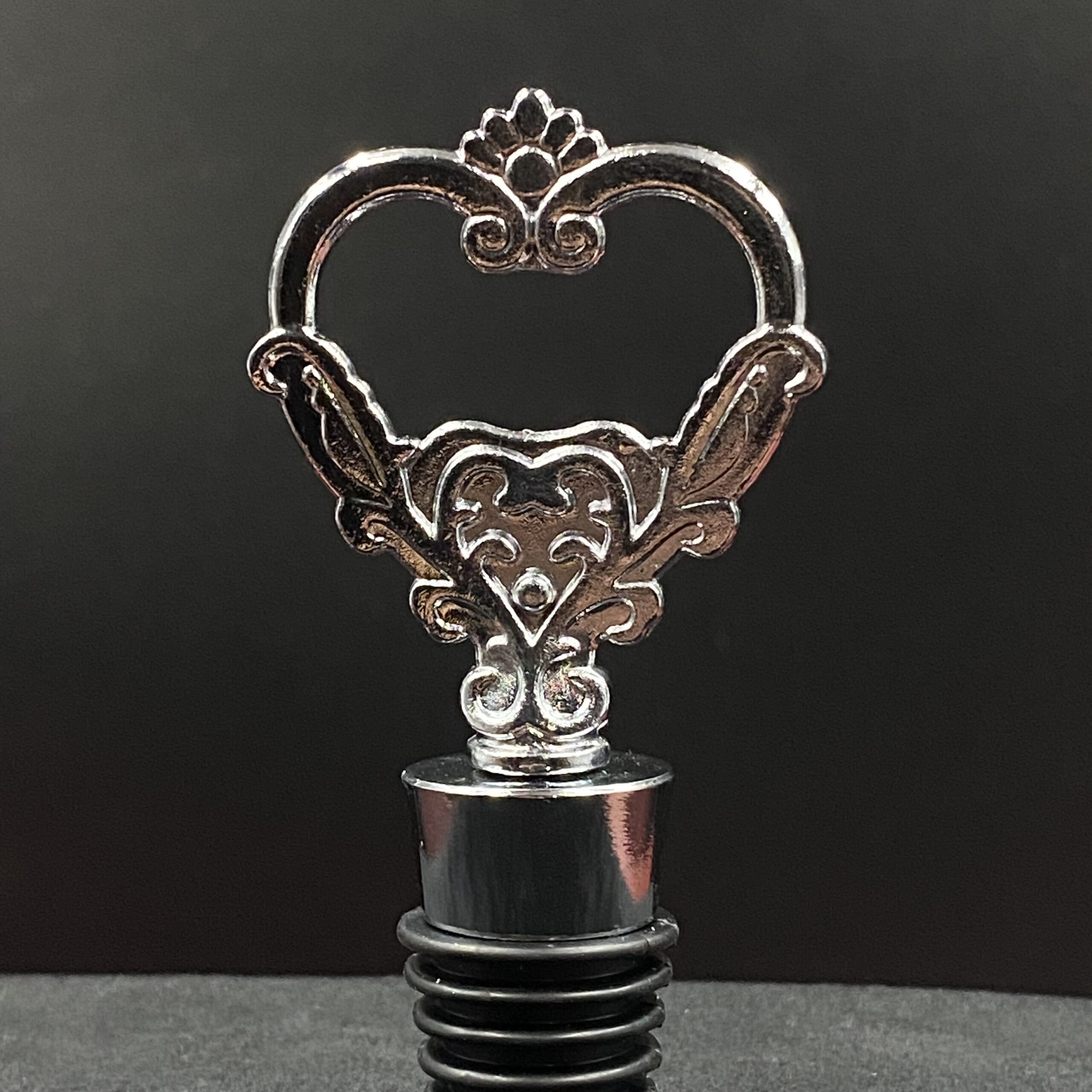 Uniwersalny korek do wina ze stali nierdzewnej zakończony rzeźbą w kształcie kwiatu serca.