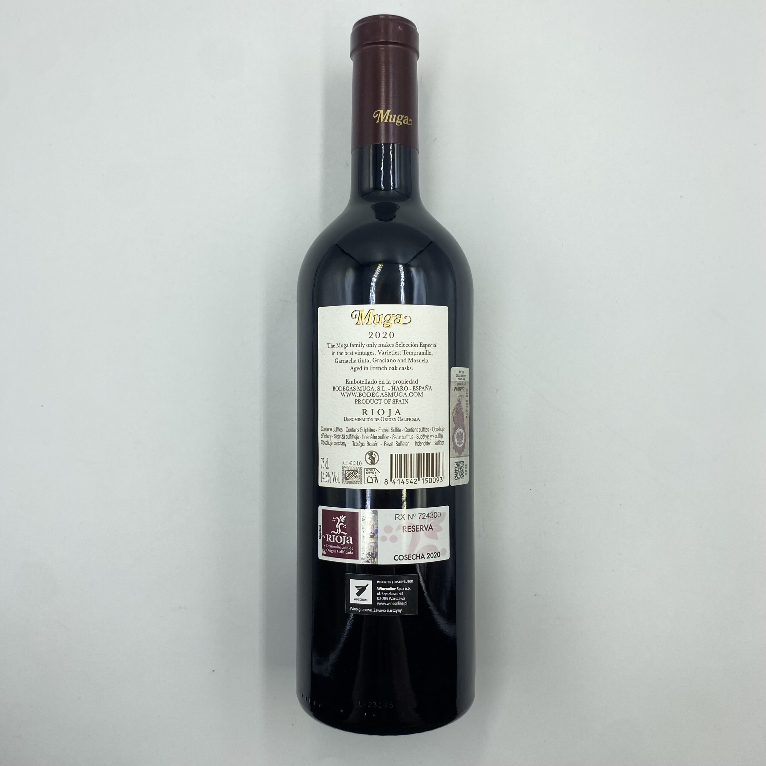 Muga Selección Especial Reserva 2020 to wytrawne czerwone wino z Hiszpanii, pochodzące z regionu Rioja, jednego z najbardziej renomowanych i historycznych regionów winiarskich kraju. Wino produkowane jest przez Bodegas Muga, rodzinny producent z długą tradycją, znany z klasycznego stylu Rioja opartego na starzeniu w dębowych beczkach i wysokiej jakości owocach. „Selección Especial Reserva” to wersja, która łączy wyraźną strukturę, elegancję i złożoność aromatyczną typową dla klasy Reserva, z wyraźnym wpływem dojrzewania w beczkach i w butelce.