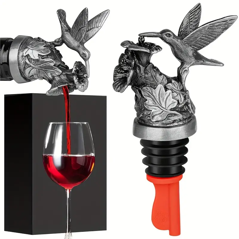 Uniwersalny metalowy nalewak do wina w kształcie kolibra spijającego nektar z kwiatka. Kolor srebrny.