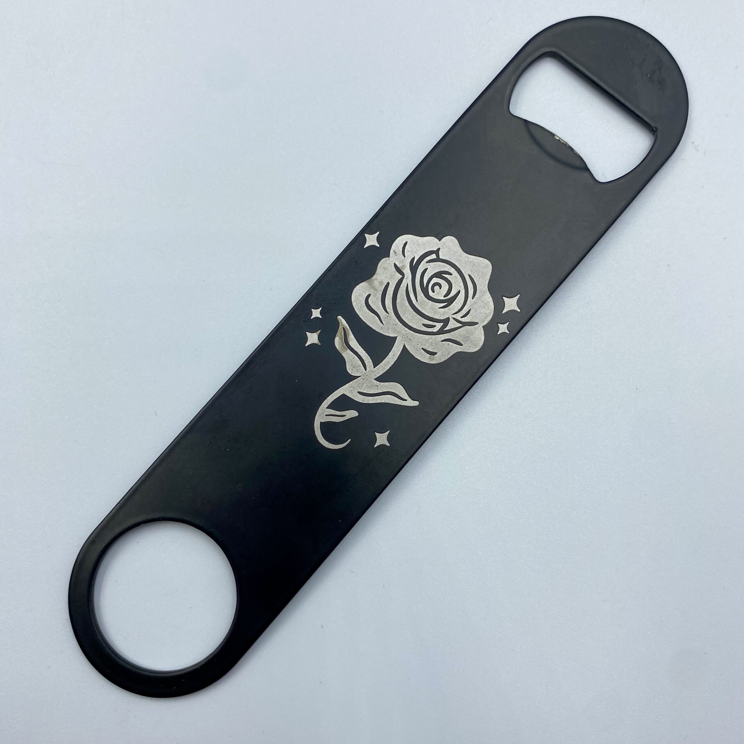 Otwieracz do piwa typu blade ze stali nierdzewnej w kolorze czarnym, z motywem róży.