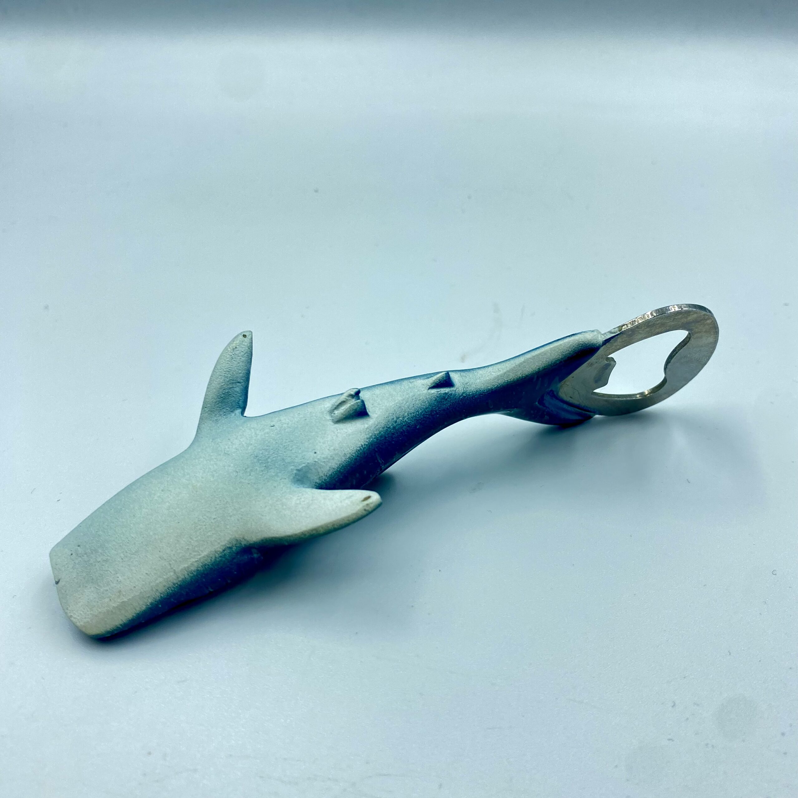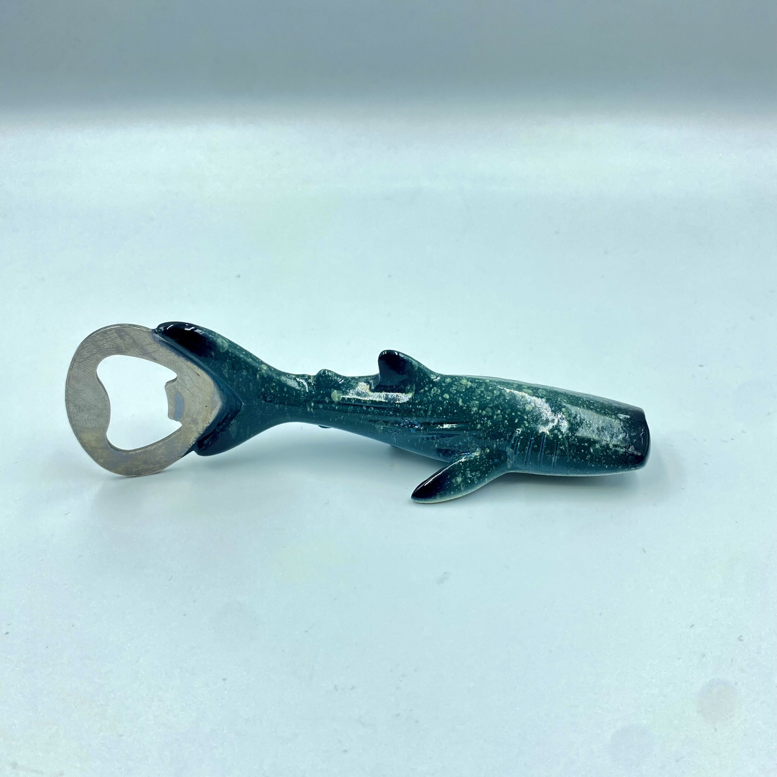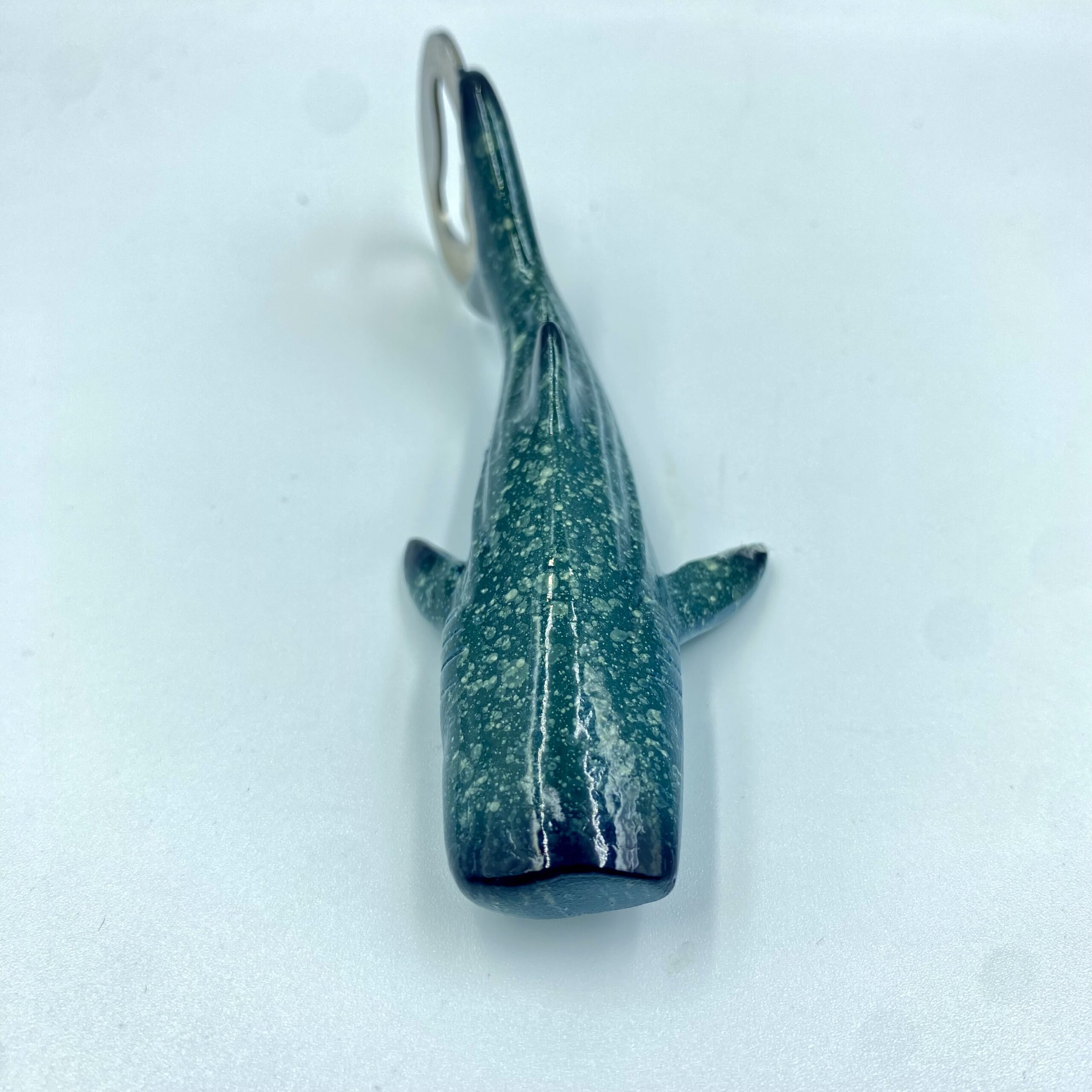 Otwieracz do piwa w kształcie rekina w kolorze ciemnozielonym.