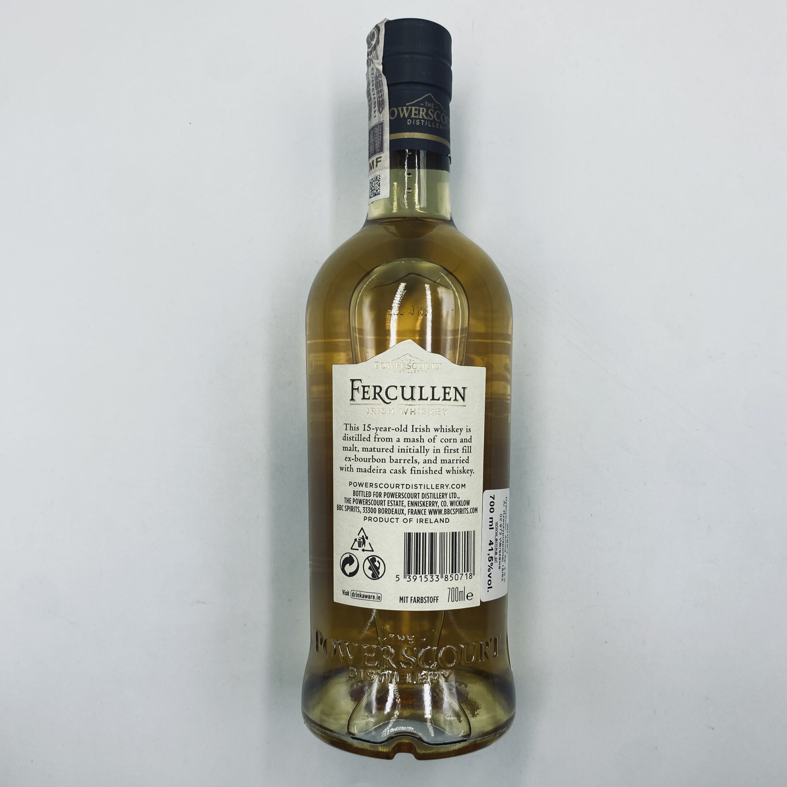 Powerscourt Fercullen 15YO 41,5% 0,7L to elegancka i dojrzała irlandzka whiskey single malt, która zachwyca złożonością smaków i aromatów, wynikającą z piętnastoletniego procesu dojrzewania. Powstaje w malowniczej destylarni Powerscourt, położonej u podnóża Wicklow Mountains, która łączy tradycję i kunszt z nowoczesnym podejściem do produkcji whiskey.