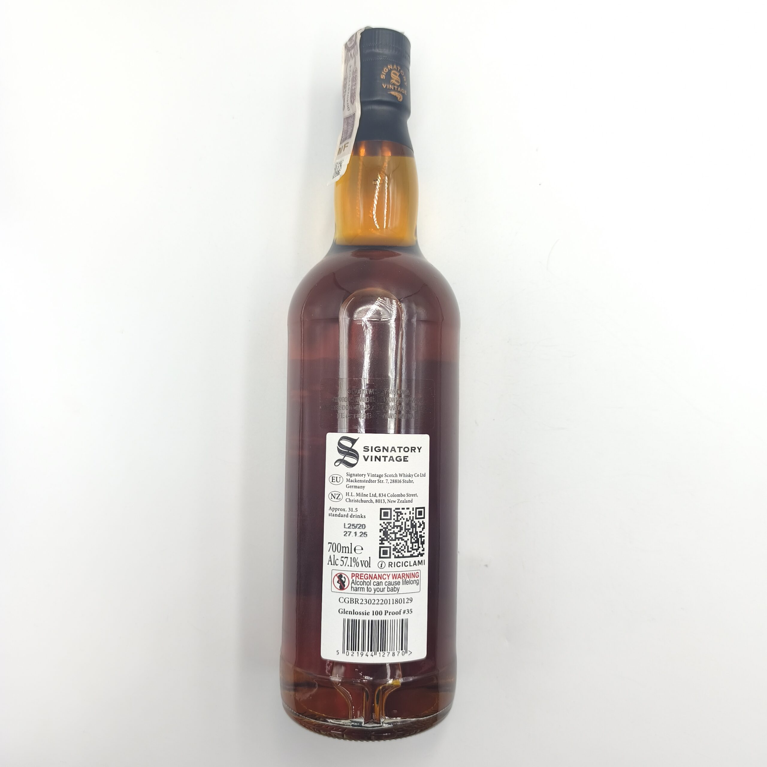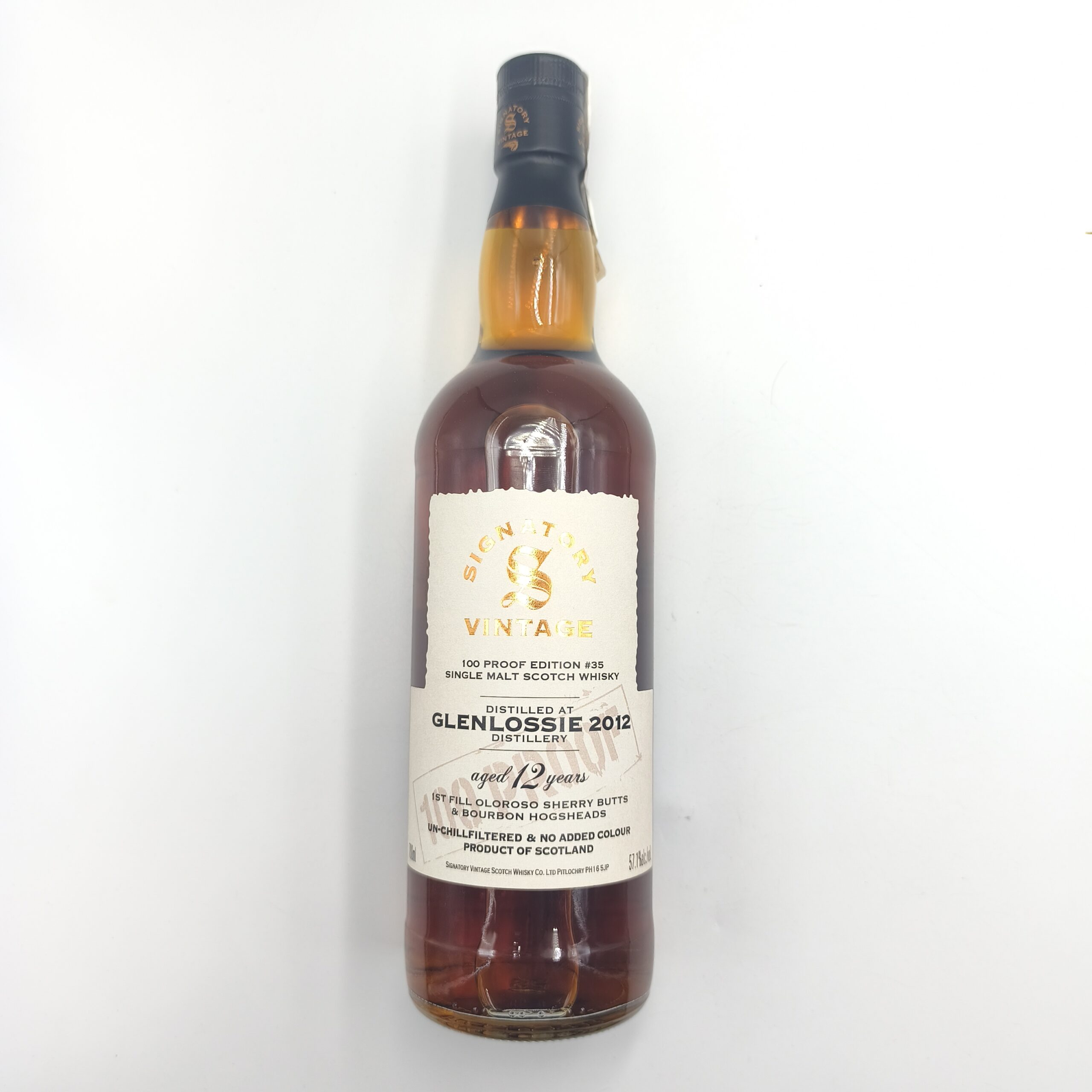 Signatory Vintage Glenlossie 2012 12 YO 57,1% 0,7 L to niezależnie butelkowana szkocka single malt whisky ze słynnej destylarni Glenlossie w regionie Speyside. Butelkę wypuścił renomowany butelkarz Signatory Vintage, w ramach serii „100 Proof Edition” — co oznacza, że whisky ma moc ok. 100 proof (57,1 % ABV). Destylacja miała miejsce w 2012 roku, a trunek leżakował przez 12 lat w beczkach typu first-fill po sherry Oloroso oraz w bourbon hogsheads. Butelkowanie odbyło się w 2025 r. jako limitowana edycja numer 35 w tej serii.