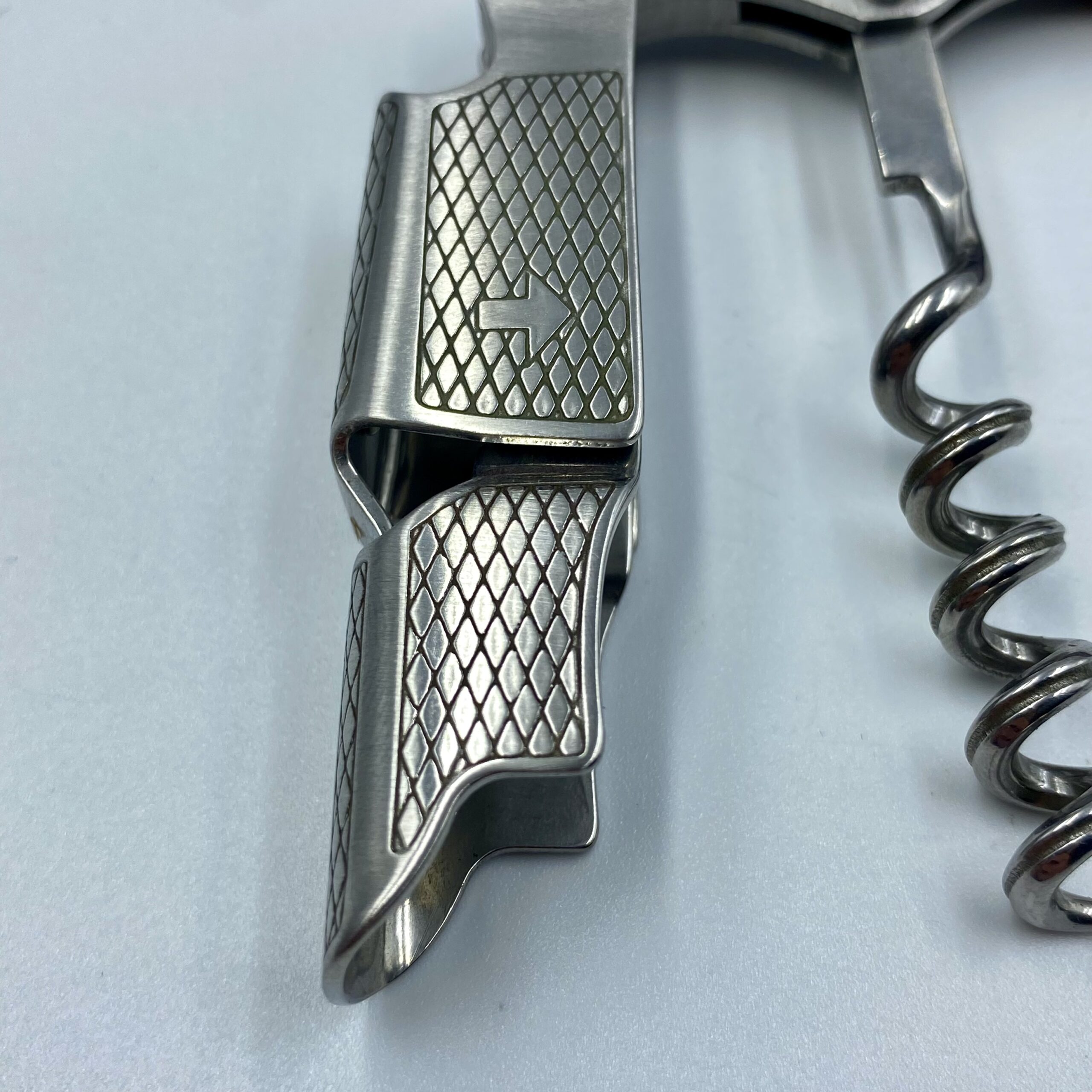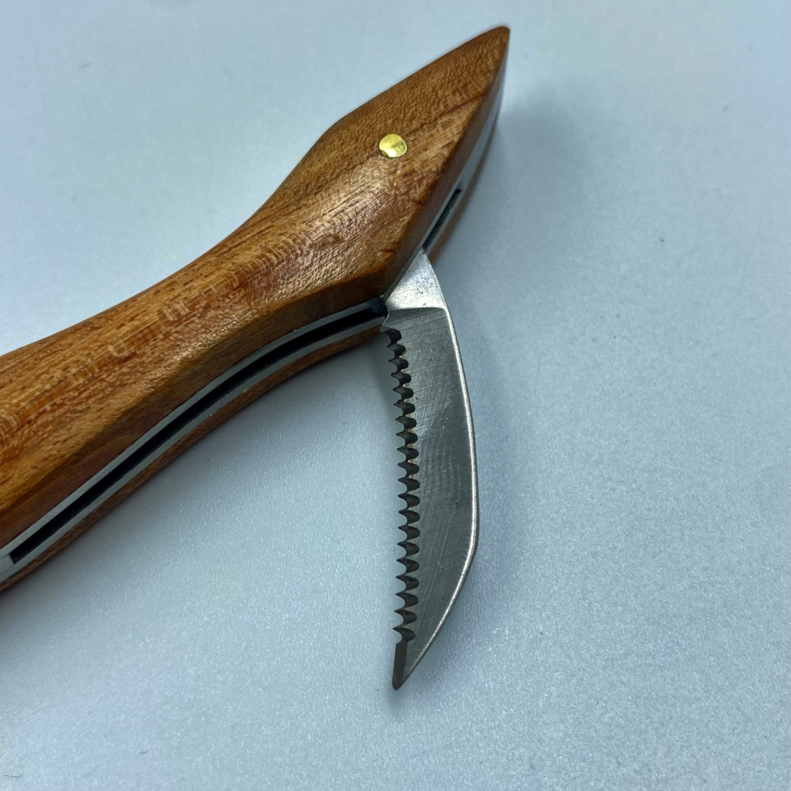 Dobrej jakości otwieracz do wina (trybuszon), z drewnianą rączką zdobiony motywem geometrycznym.